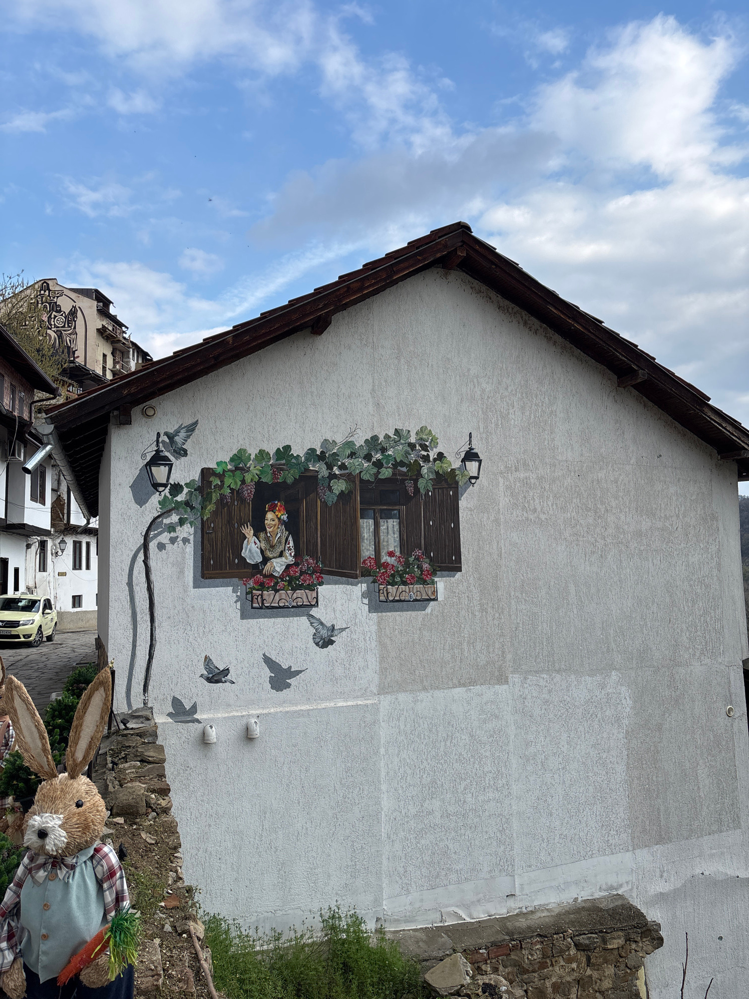 An eye-level medium shot of a wall, featuring a trompe l'oeil mural painting, possibly located in Veliko Tarnovo, Bulgaria. The painting depicts an open window, adorned with grapes, flowers, and a wom…read more