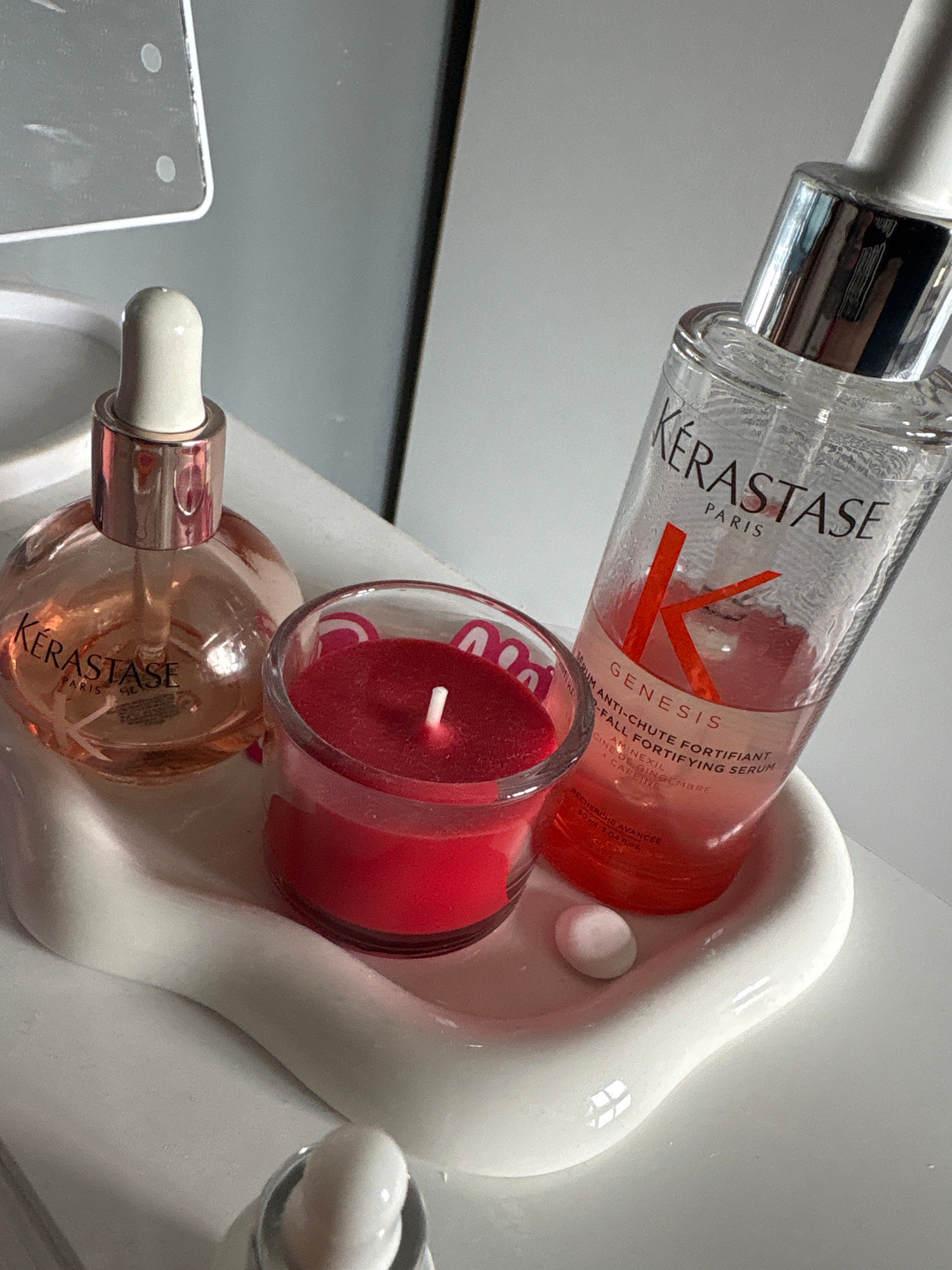The image shows a close-up view of various items arranged in what appears to be a white, kidney-shaped sink. The objects include a bottle of Kérastase Genesis serum, a small red candle in a glass hold…read more
