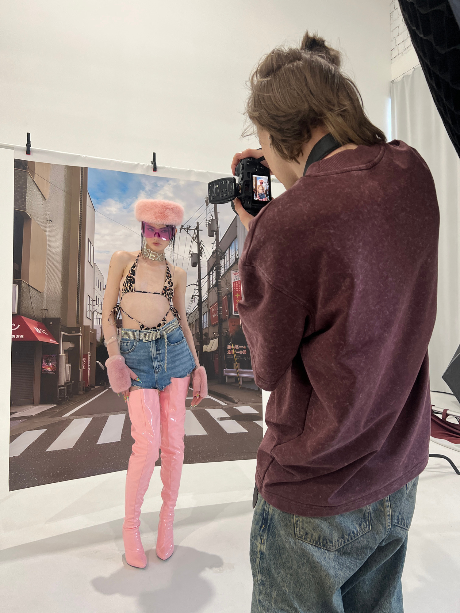 A fashion photoshoot is taking place in a brightly lit studio, located in Khimki, Russia. The image is captured from a slightly elevated perspective, looking down at the scene. In the foreground, a p…read more