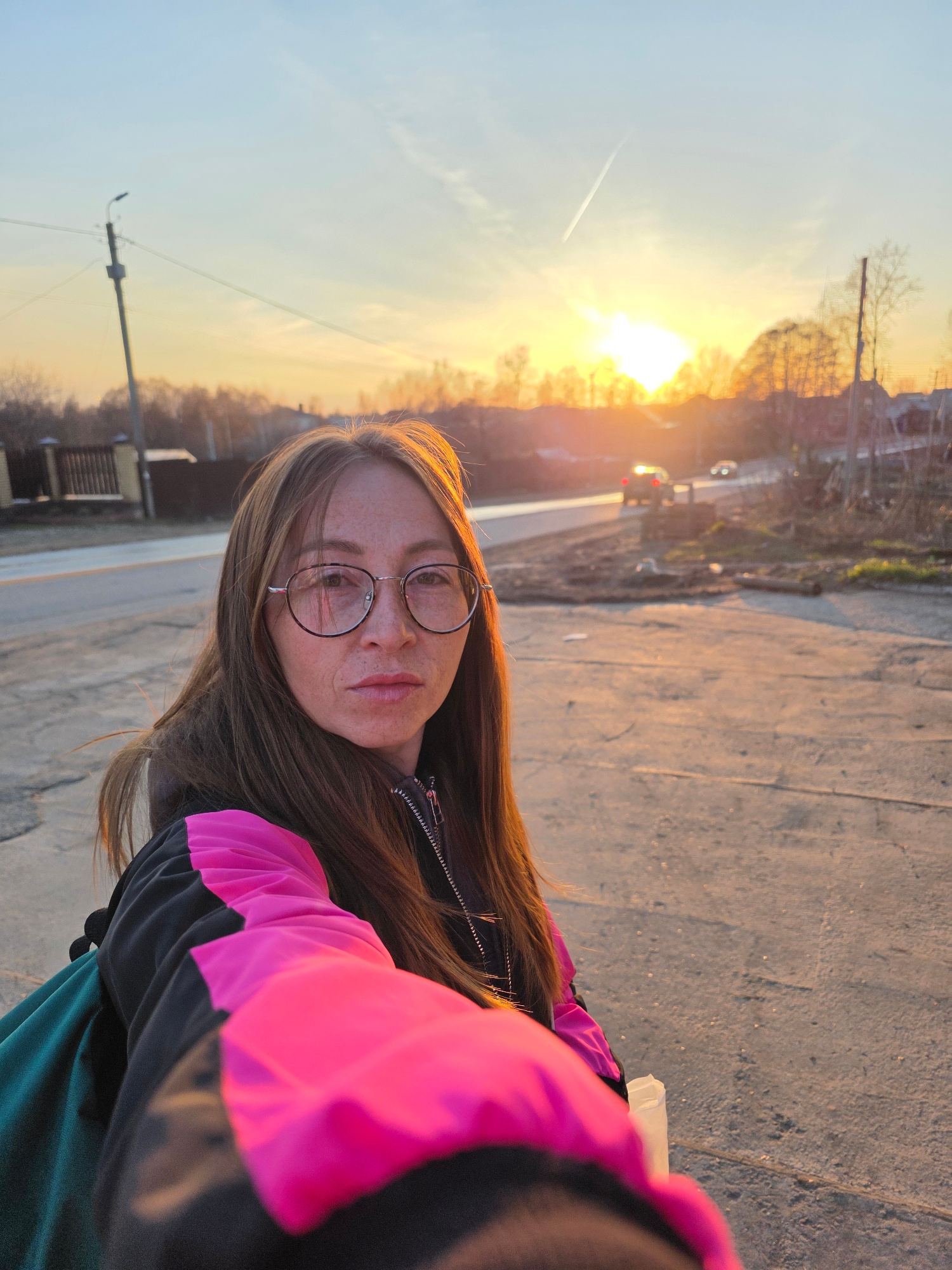 A person with long brown hair, wearing glasses and a black and pink jacket, is taking a selfie on a paved surface. The background reveals a sunset with trees and buildings partially obscured by the li…read more