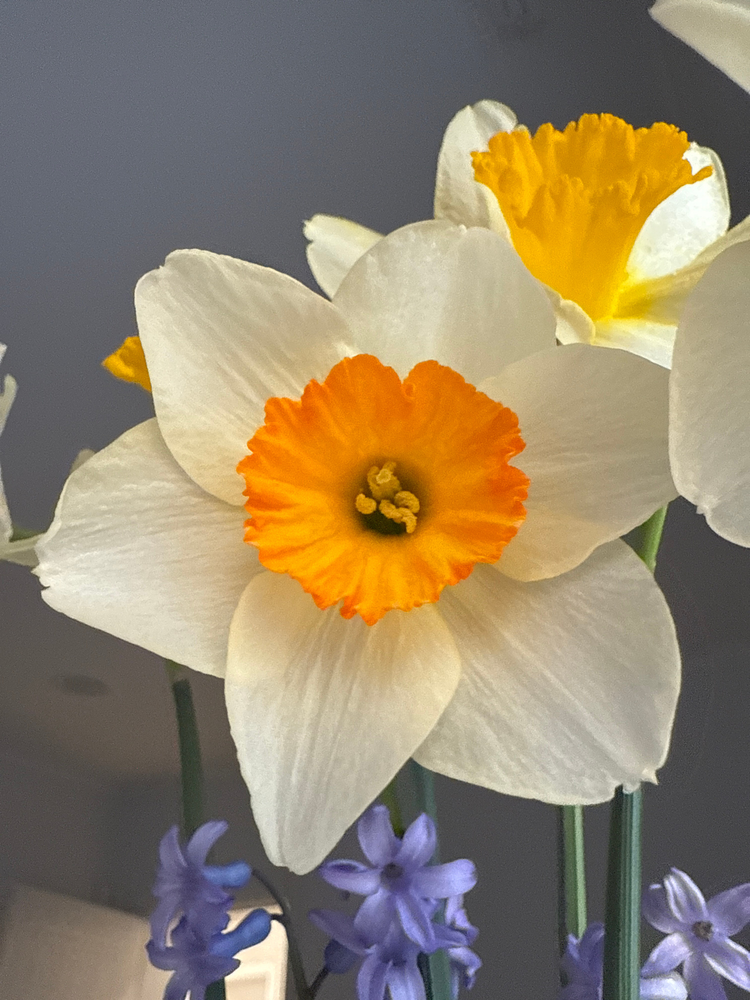 A close-up shot displays a cluster of flowers, prominently featuring a daffodil with white petals surrounding an orange center. Another daffodil with yellow coloring is partially visible on the left s…read more