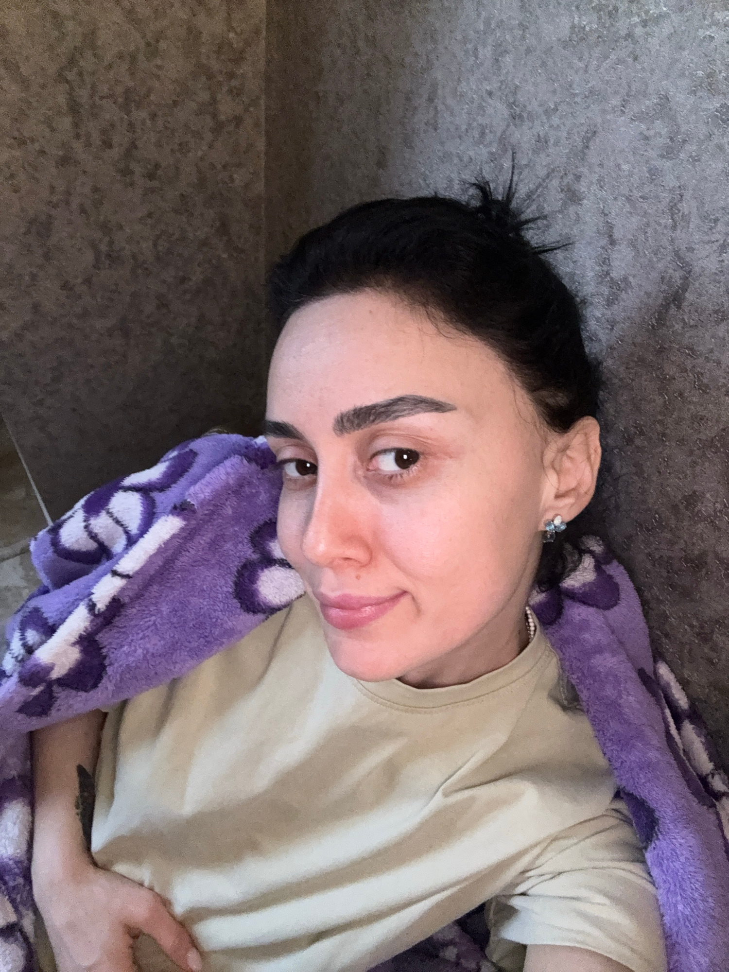 The image displays an adult female in a close-up, selfie-style photograph taken indoors. She has dark hair, styled partially up with some strands loose, and dark, well-defined eyebrows. Her light brow…read more