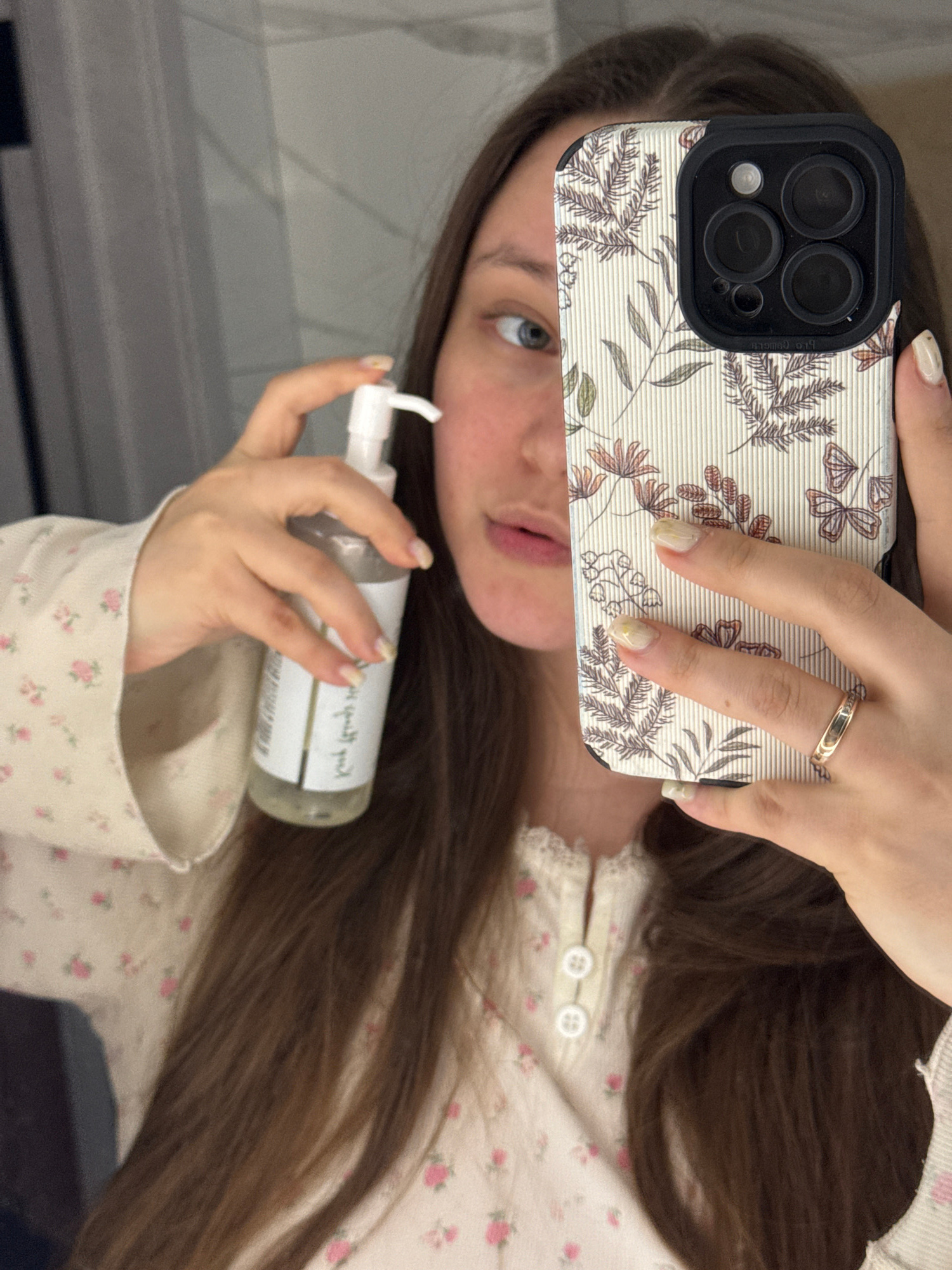 A woman is taking a selfie in an indoor bathroom setting. She is holding a white lotion or soap bottle with a pump dispenser in one hand and a smartphone in the other, obscuring part of her face with…read more