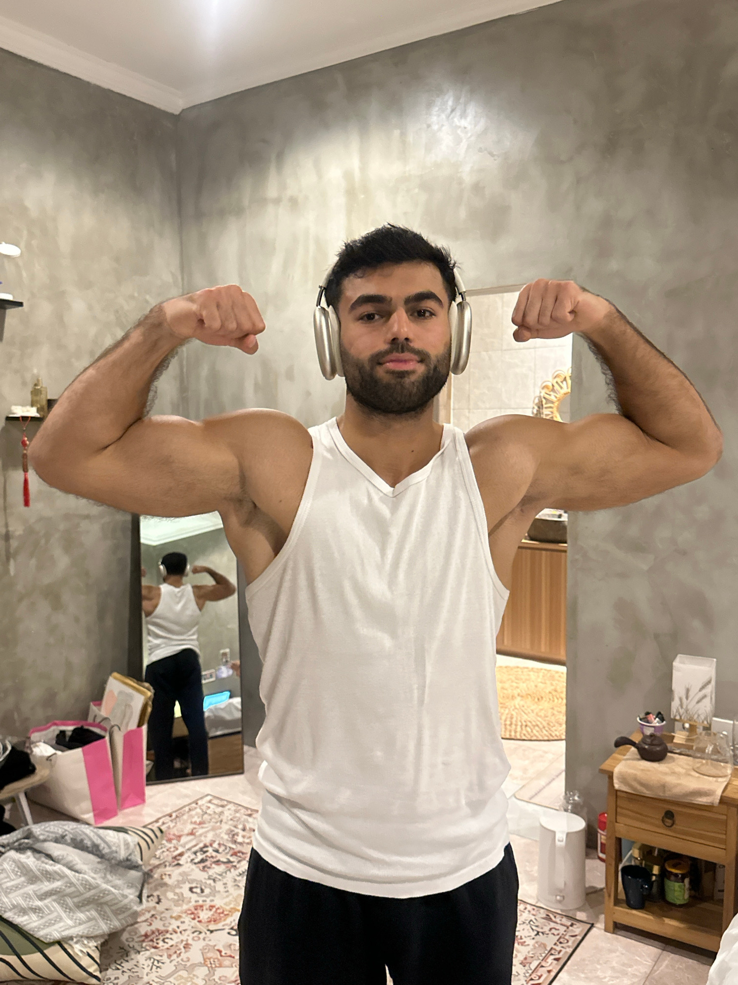 A man with dark hair and a beard, wearing a white tank top and black pants, is posing in front of a mirror. He is flexing both arms, showing off his biceps. He is also wearing headphones. The backgrou…read more