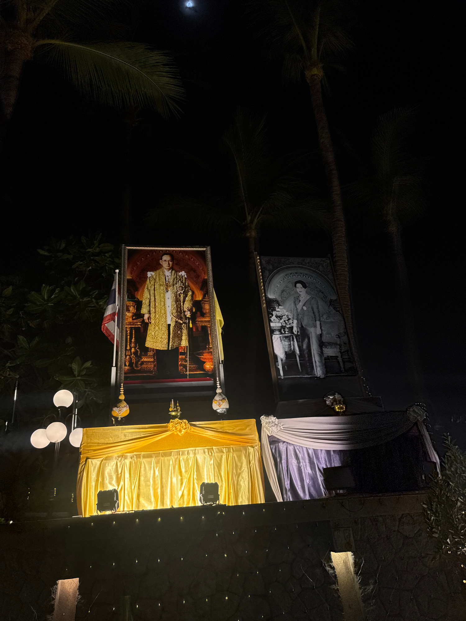 The image was taken at night and shows two framed portraits, likely of Thai royalty, on display. The portraits are illuminated and decorated with draped fabrics and ornaments. A Thai flag is visible nā¦read more