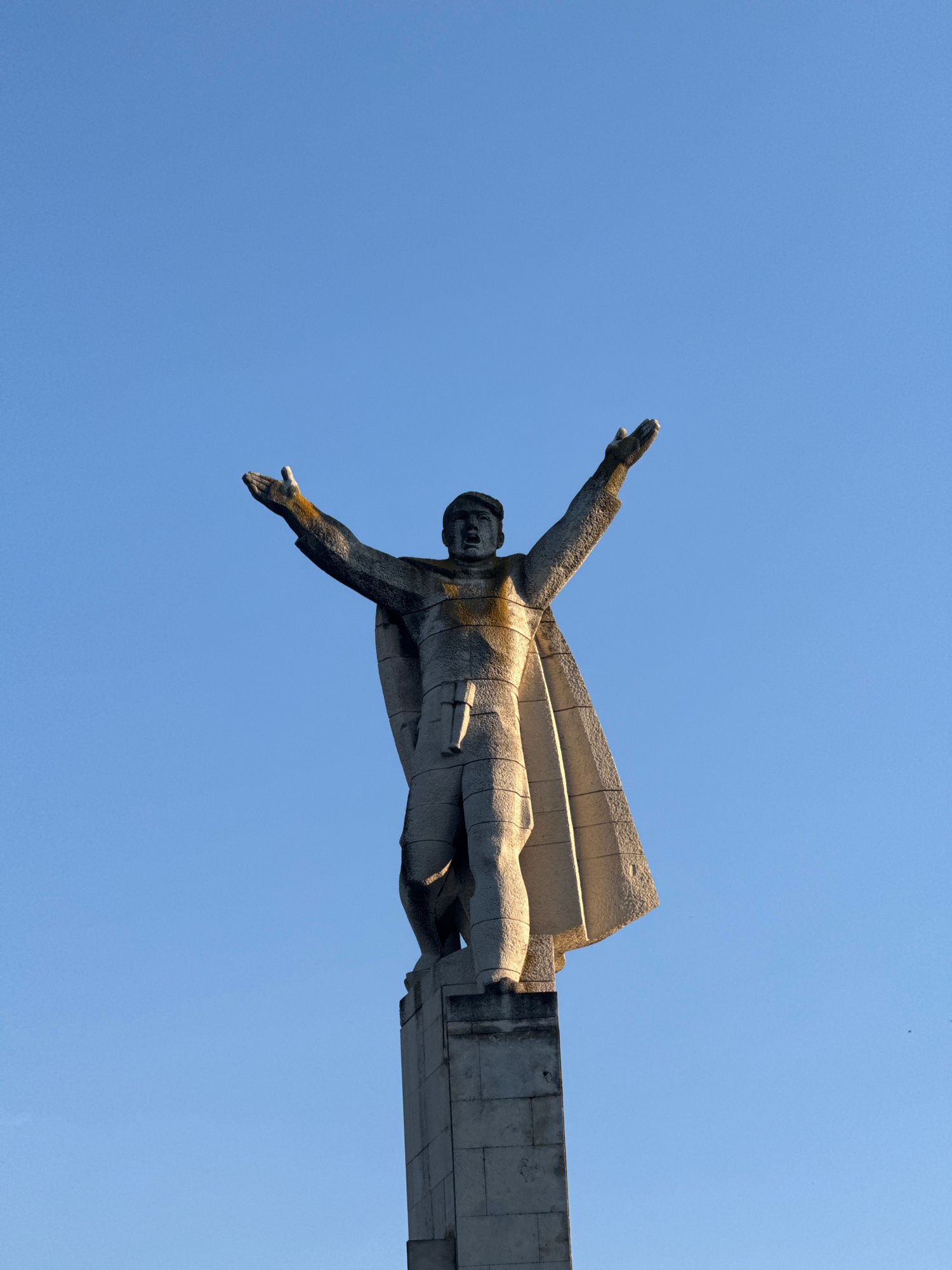 The image is a low-angle shot of the Monument to 1300 Years of Bulgaria, a large monument located in Shumen, Bulgaria. The monument features a stone statue of a figure with outstretched arms against a…read more