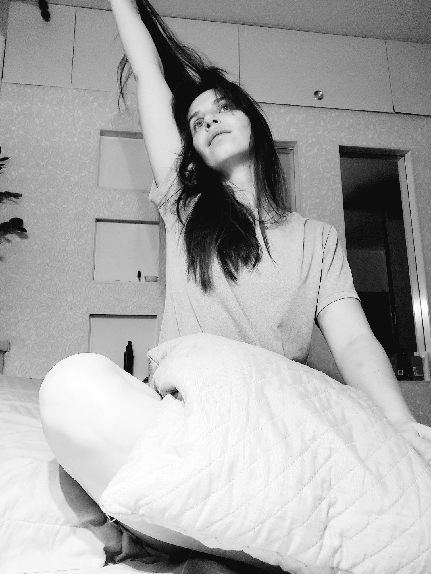 A grayscale image shows a woman lying on a bed with her head tilted towards the left and her right arm extended upwards. She is wearing a light-colored shirt. A white quilted object covers the right s…read more