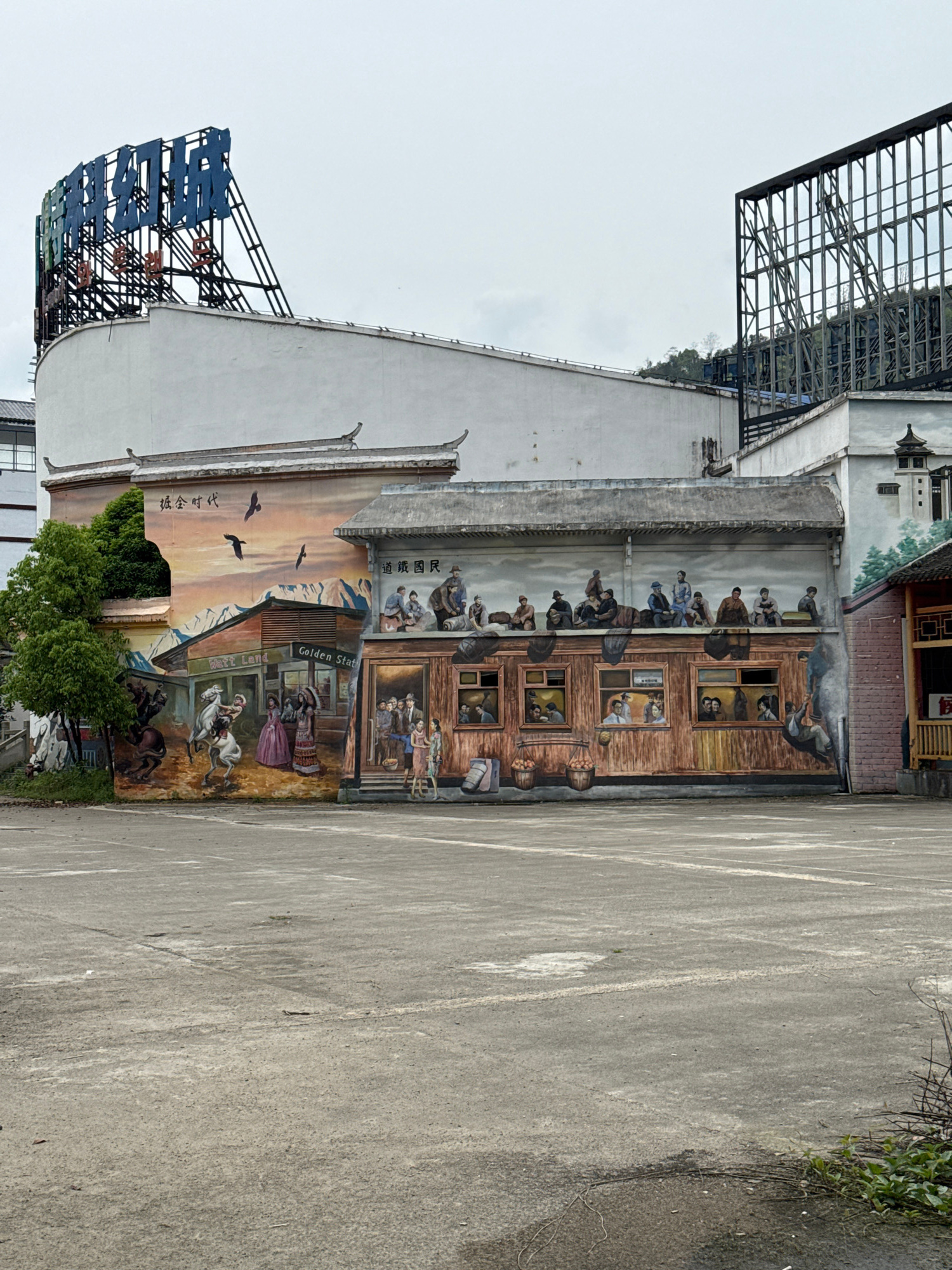 A vibrant, detailed mural adorns the side of a building, depicting a series of historical or themed scenes. The building features traditional East Asian architectural elements, including a white facad…read more