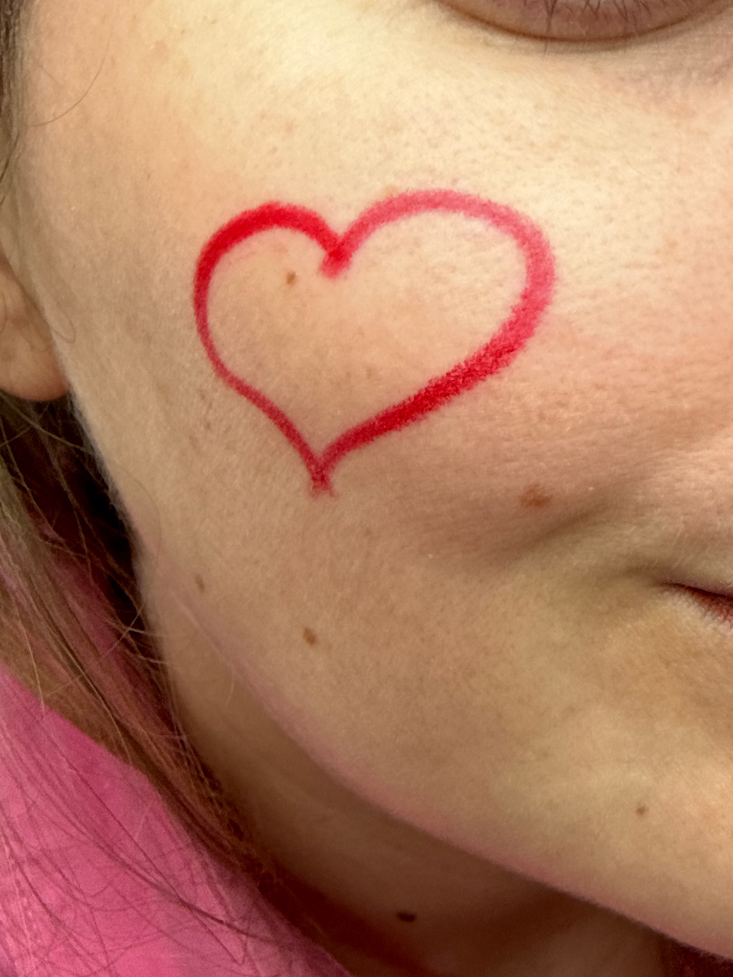 A close-up photograph shows a person's face with a red heart drawn on their cheek. The person's eye and cheek are visible, along with some hair. There are also a few moles on the person's face. There…read more