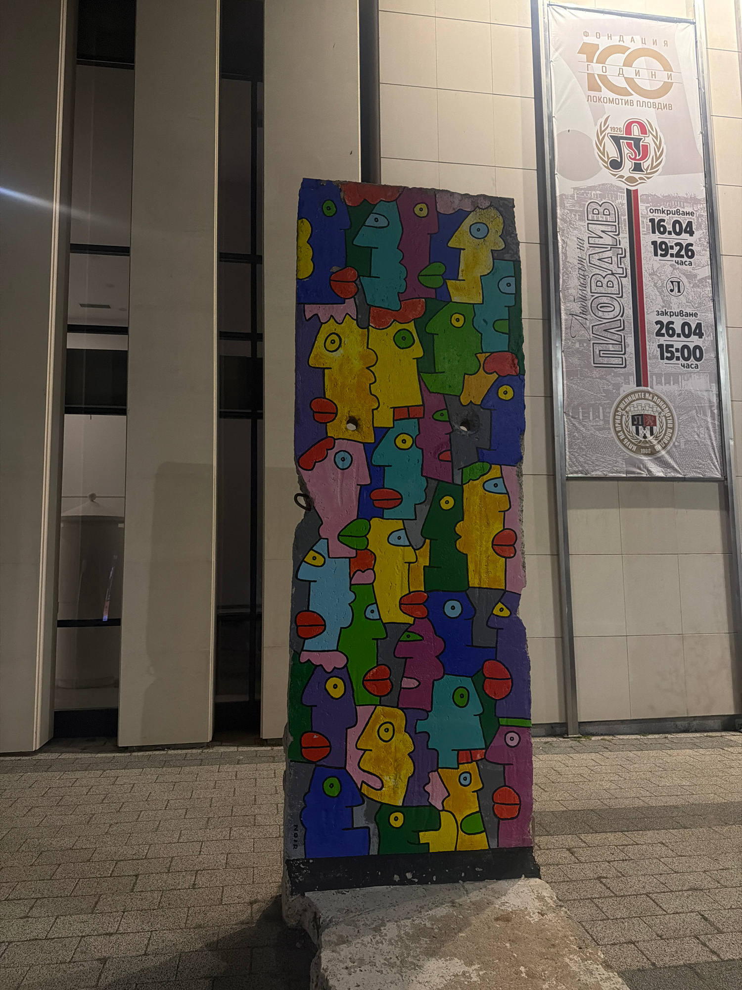 The image shows a vibrant, abstract mural displayed outdoors beneath a large commemorative banner. The mural features a dense, interlocking pattern of stylized, colorful figures resembling fish or fan…read more