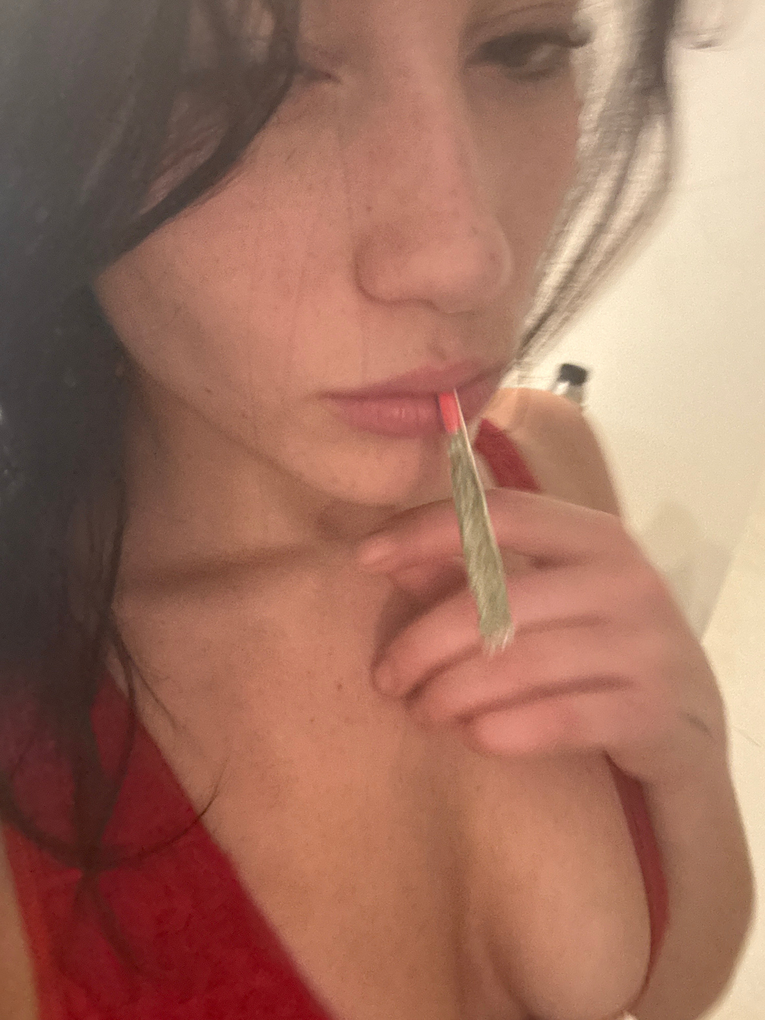 A close-up, blurred image shows a person with dark hair, fair skin, and a red garment, possibly lingerie, lying down. They are holding a rolled cigarette or joint in their mouth. The background is ind…read more