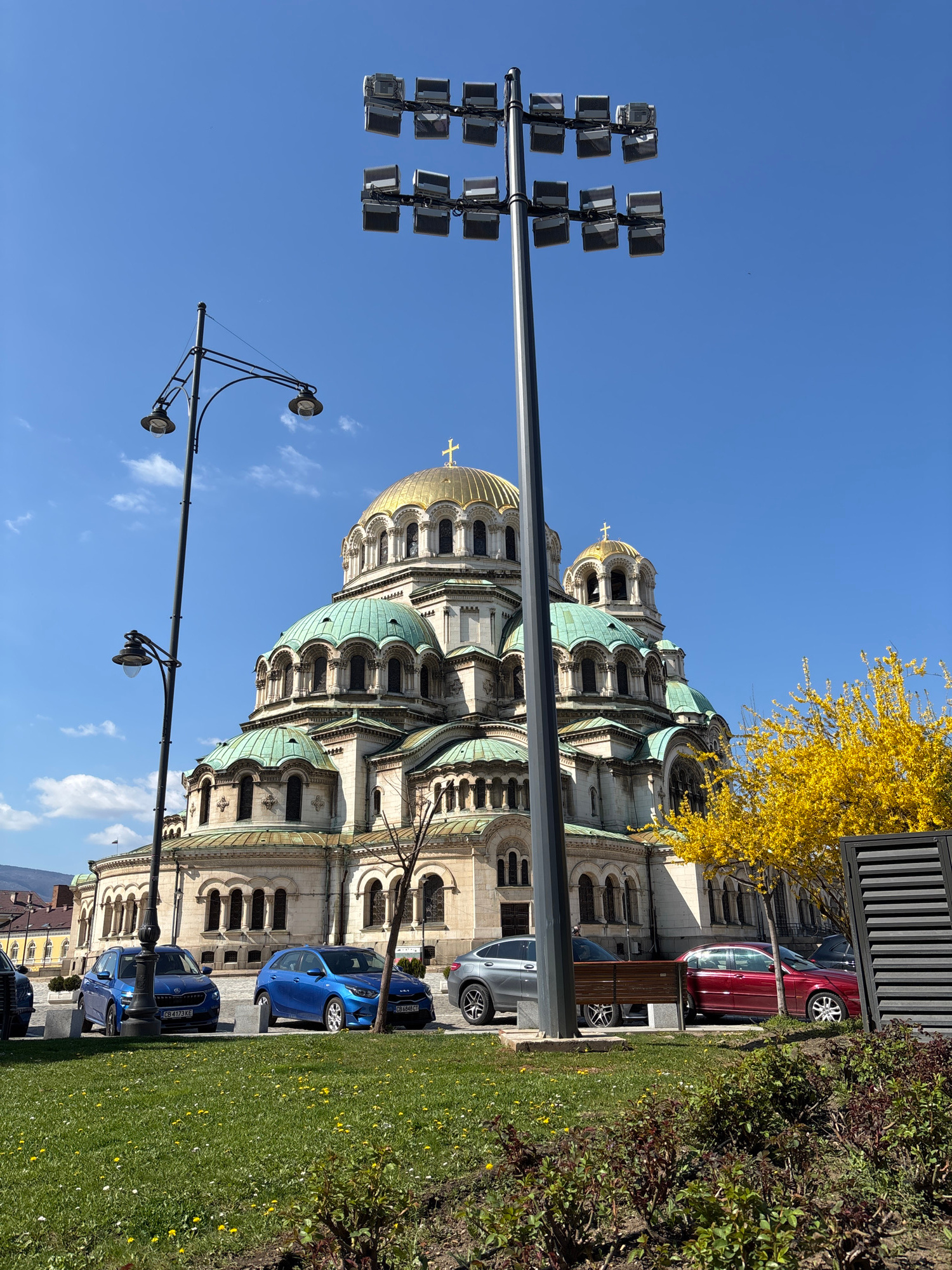 The image shows the Alexander Nevsky Cathedral in Sofia, Bulgaria, on a sunny day. The cathedral, with its gold domes and green roof, dominates the scene. Several cars are parked along the side of the…read more