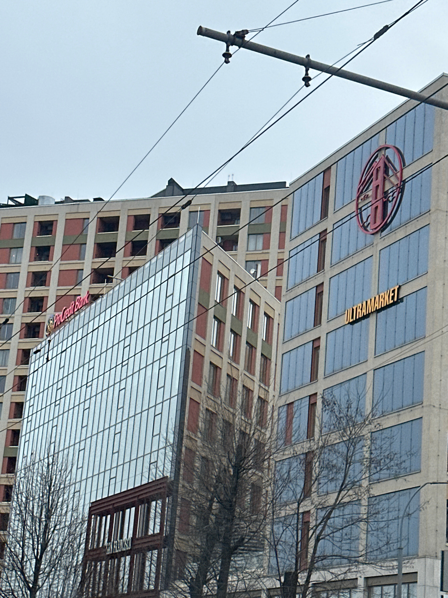 Here's a description of the image: The image shows a building in Kyiv, Ukraine, specifically the "ULTRAMARKET" building, which is a department store. The building has a grid-like facade with many winβ¦read more