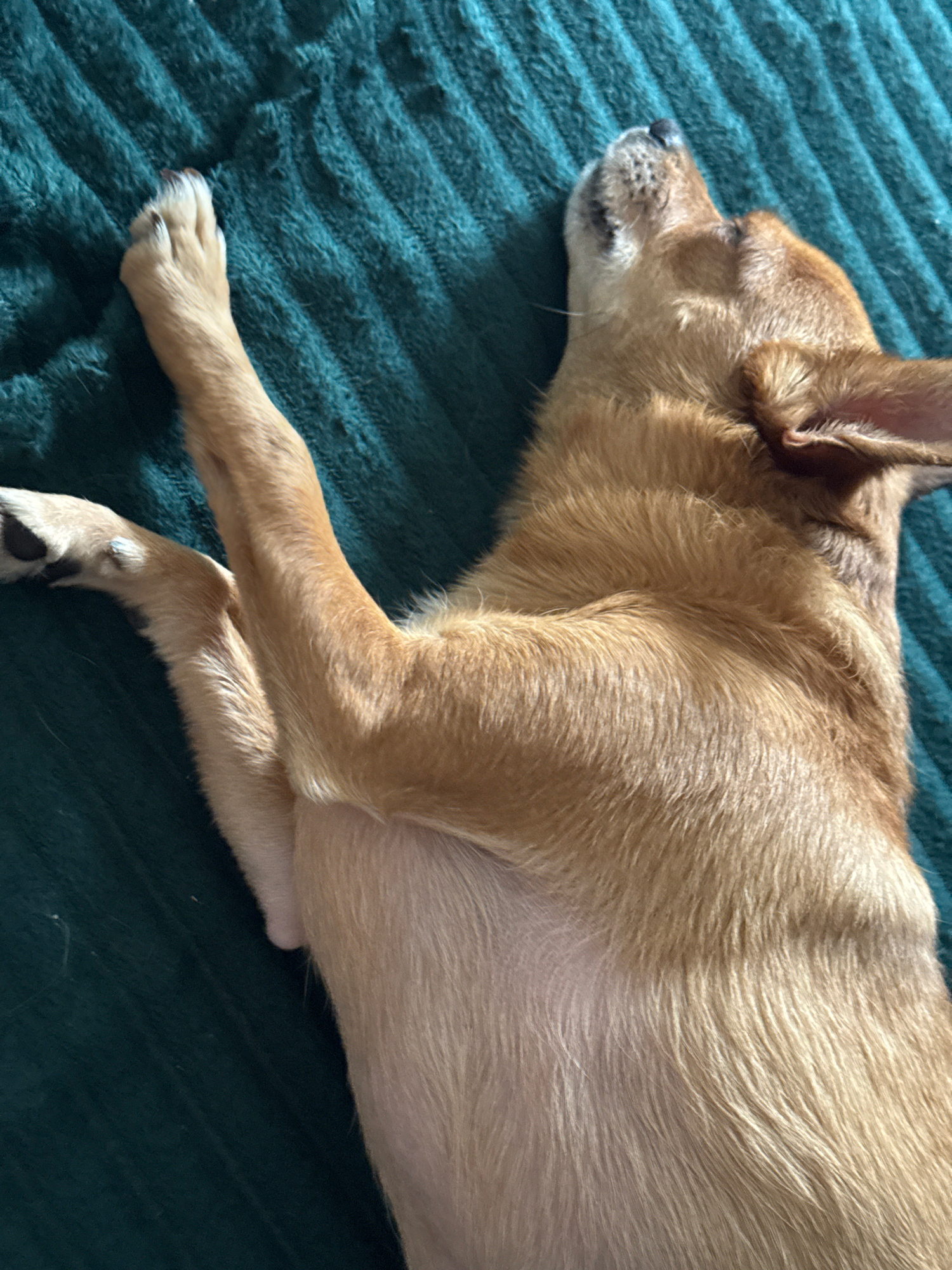 A light brown or tan-colored dog is depicted lying down, seemingly asleep or resting peacefully, on a dark teal or emerald green textured blanket. The dog is positioned in profile, facing left, with i…read more