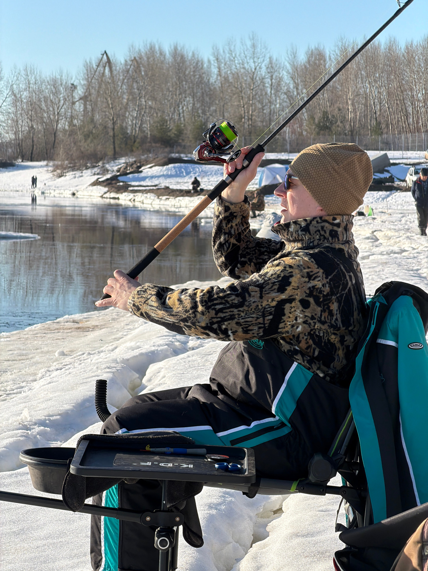 A person is ice fishing, dressed in a tan knit hat and a camouflage patterned jacket, standing near a body of water with snow and ice on the banks. The person is holding a fishing rod with a red and s…read more