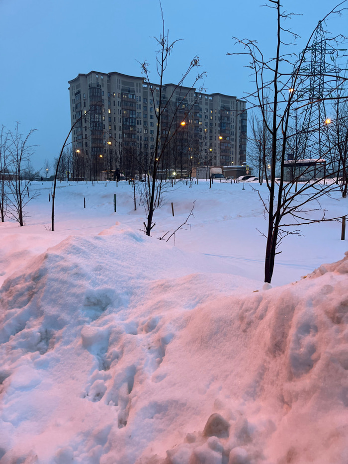 The image depicts an urban winter landscape at dusk or dawn in Odintsovo, Russia. The foreground features substantial, irregularly shaped piles of snow, exhibiting a pinkish-orange hue on surfaces fac…read more