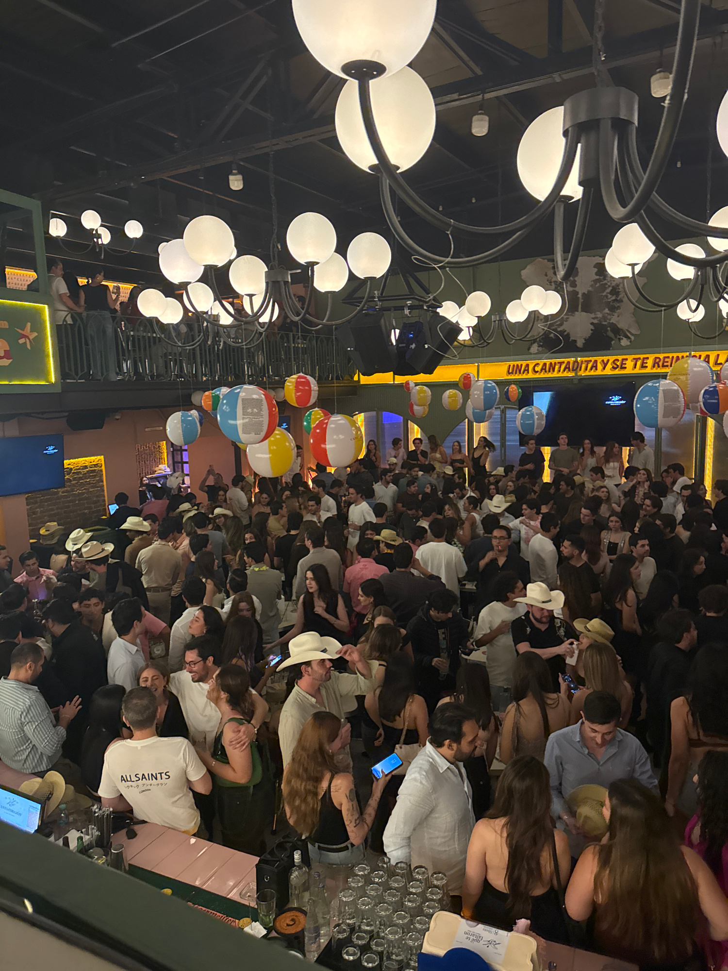The image depicts a crowded indoor scene, likely a bar or club in León, Mexico, given the Spanish signage and general setting. The space is filled with numerous people, many wearing cowboy hats, sugge…read more
