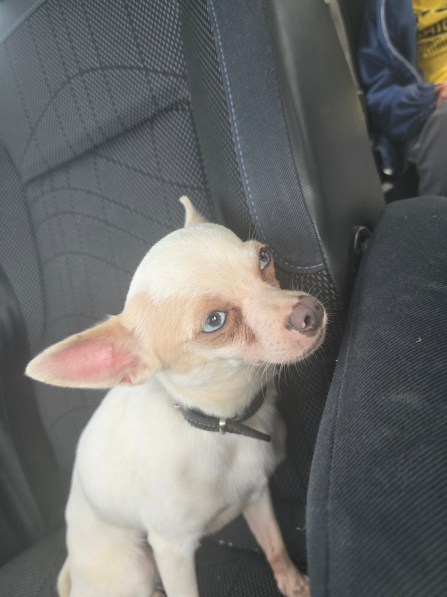 A small, white-furred dog with light brown patches on its face and striking blue eyes is positioned on a black car seat. The dog is wearing a black collar. The background is blurred. The location is W…read more