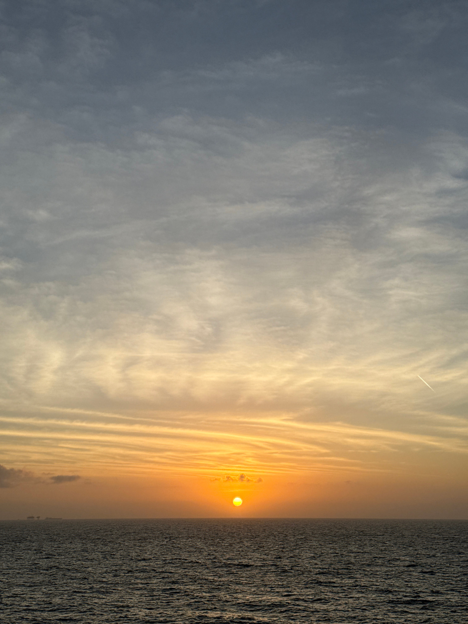 A landscape view of a horizon during sunset. The sky is filled with clouds in the left portion and streaks of golden, orange light in the right. The sun is a bright sphere near the horizon line. A dar…read more