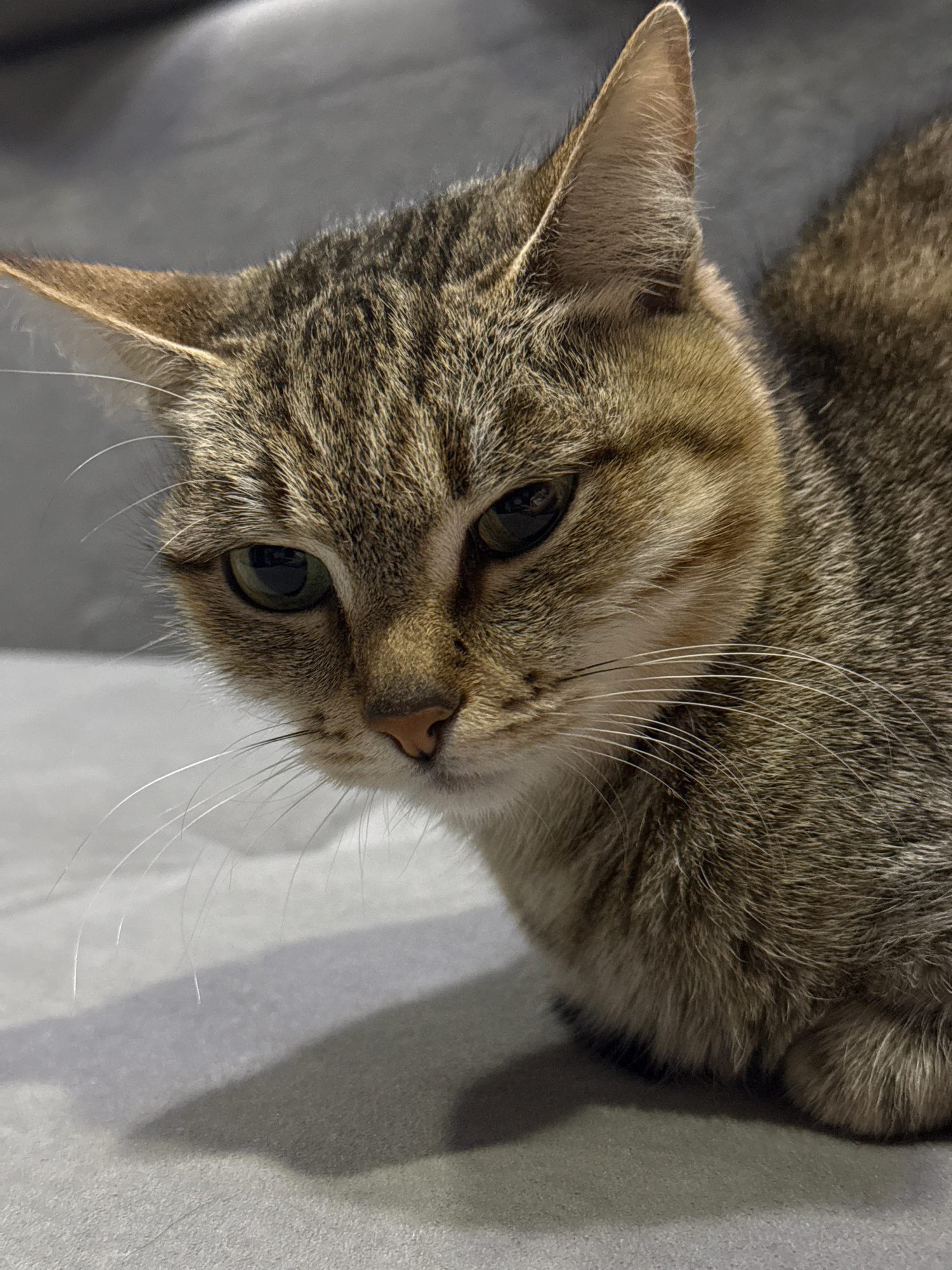 A close-up, slightly angled, high-definition image features a tabby cat lying on a gray surface. The cat's head is prominent, with detailed fur patterns and visible whiskers. Its eyes are open and app…read more