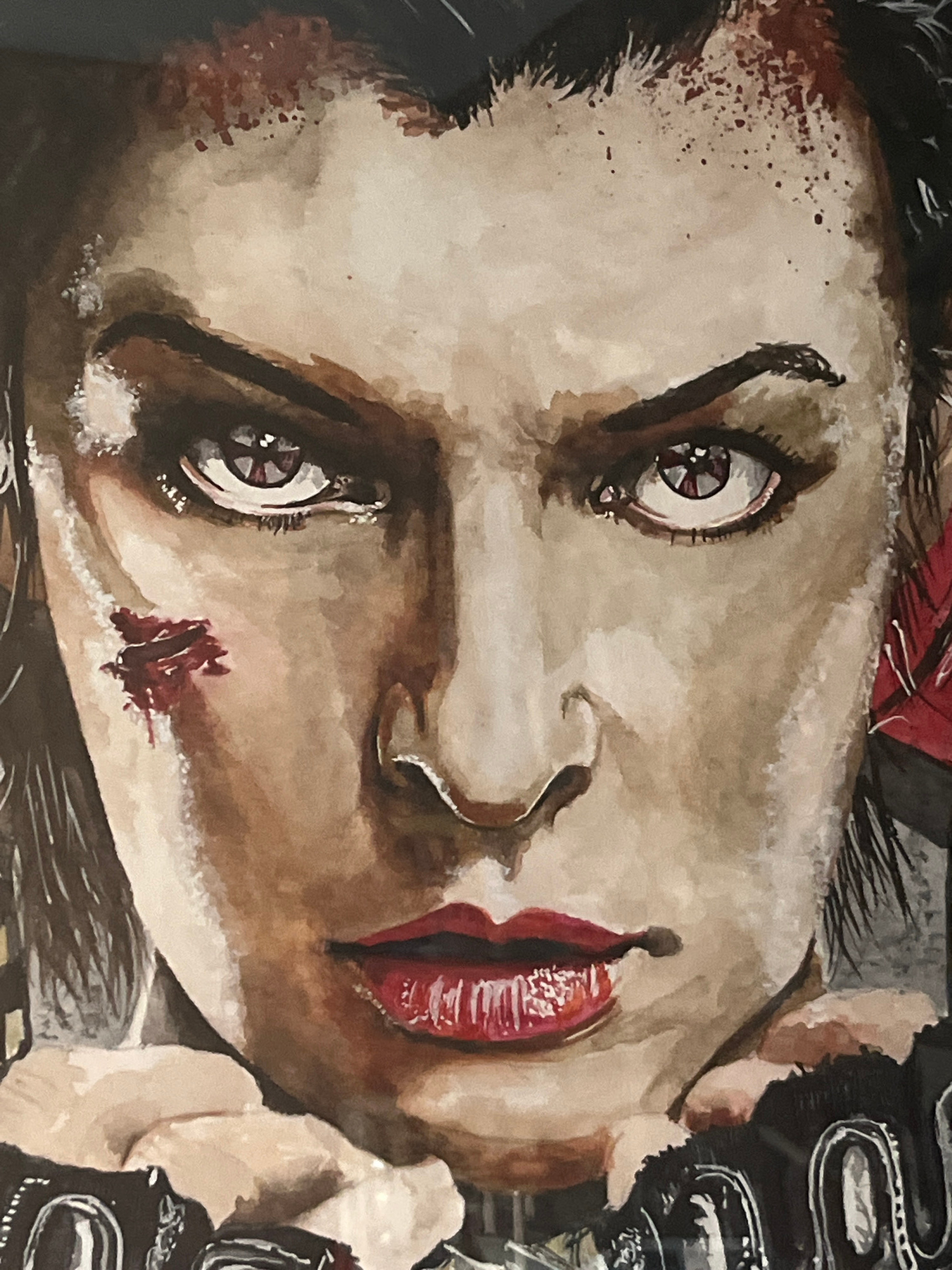A watercolor painting depicts a person's face in a close-up, tilted perspective. The person has pale skin, striking red lips, and wide, expressive eyes. Dark, undefined areas surround the eyes and acc…read more