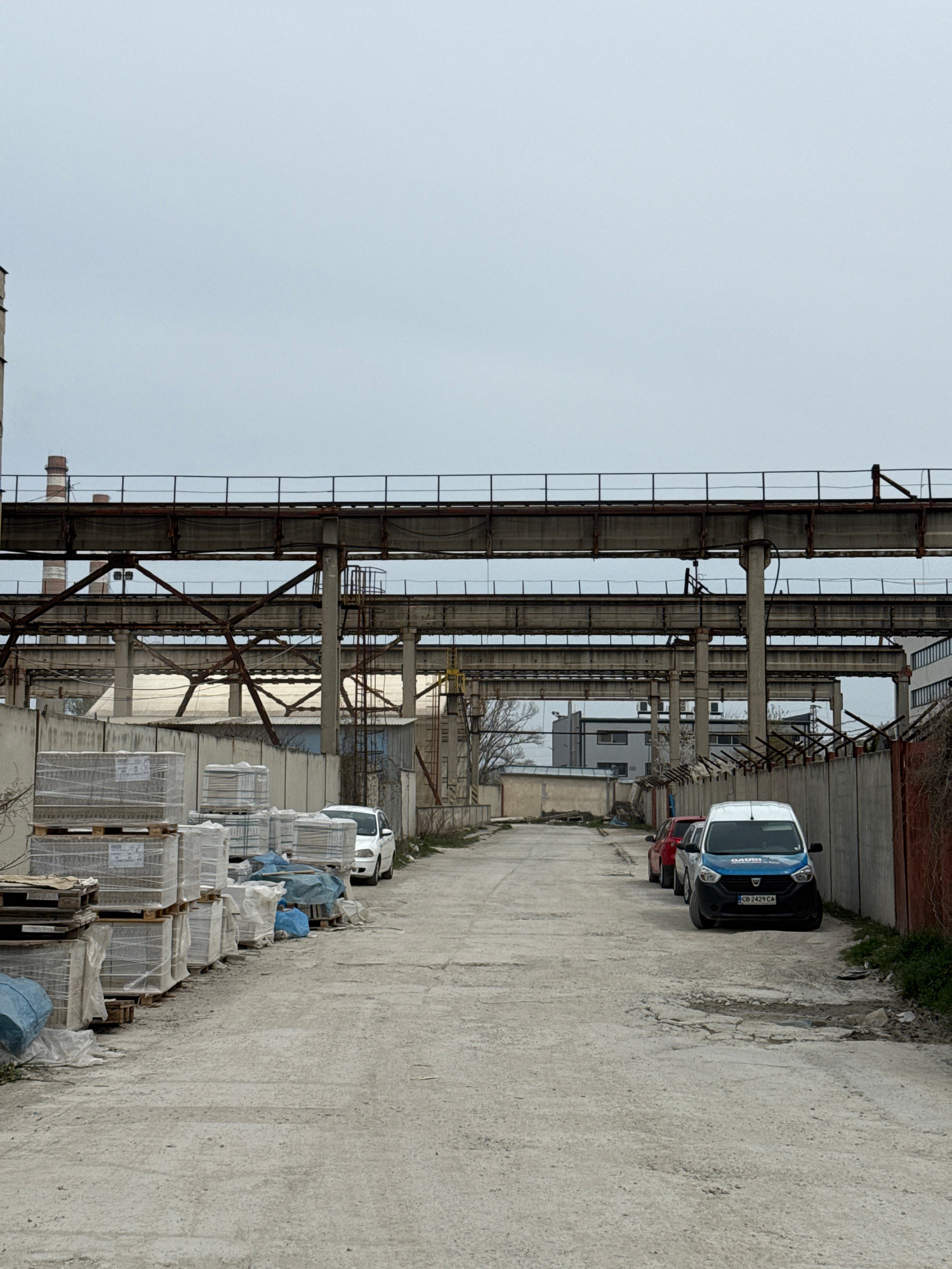 The scene is an industrial area located in Busmantsi, Bulgaria. The foreground features stacks of packaged materials on wooden pallets. To the left, a large, overhead metal structure dominates the vie…read more