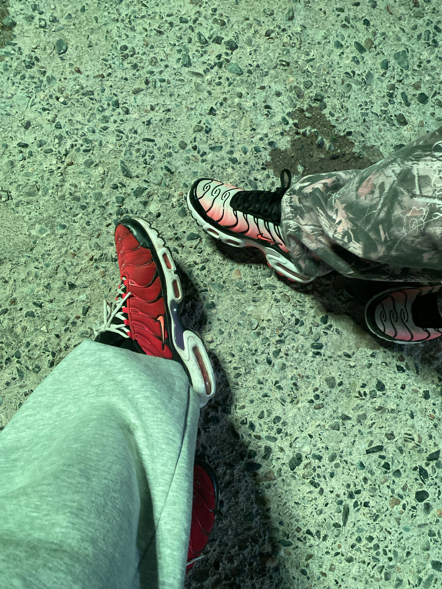 The image shows a ground-level view of two pairs of legs and feet on a pavement consisting of light-colored aggregate concrete. The legs on the left are wearing patterned camouflage pants, and the fee…read more