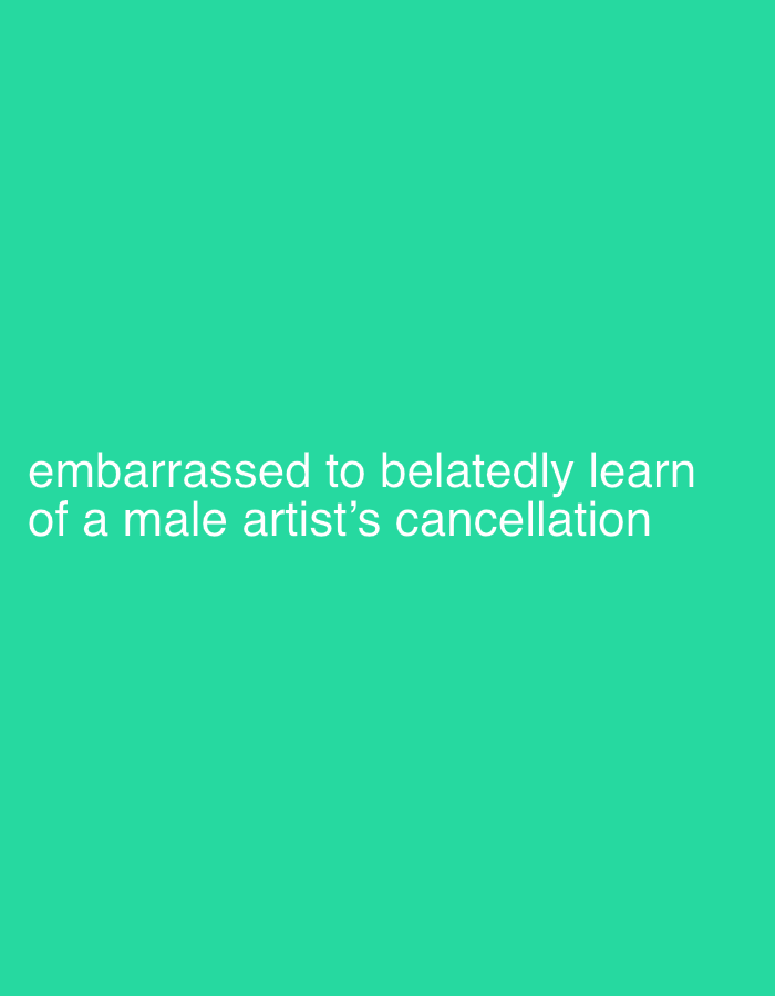 The image is a light green background with white text that reads, "embarrassed to belatedly learn of a male artist's cancellation." There is no indication of the location, city, or country.