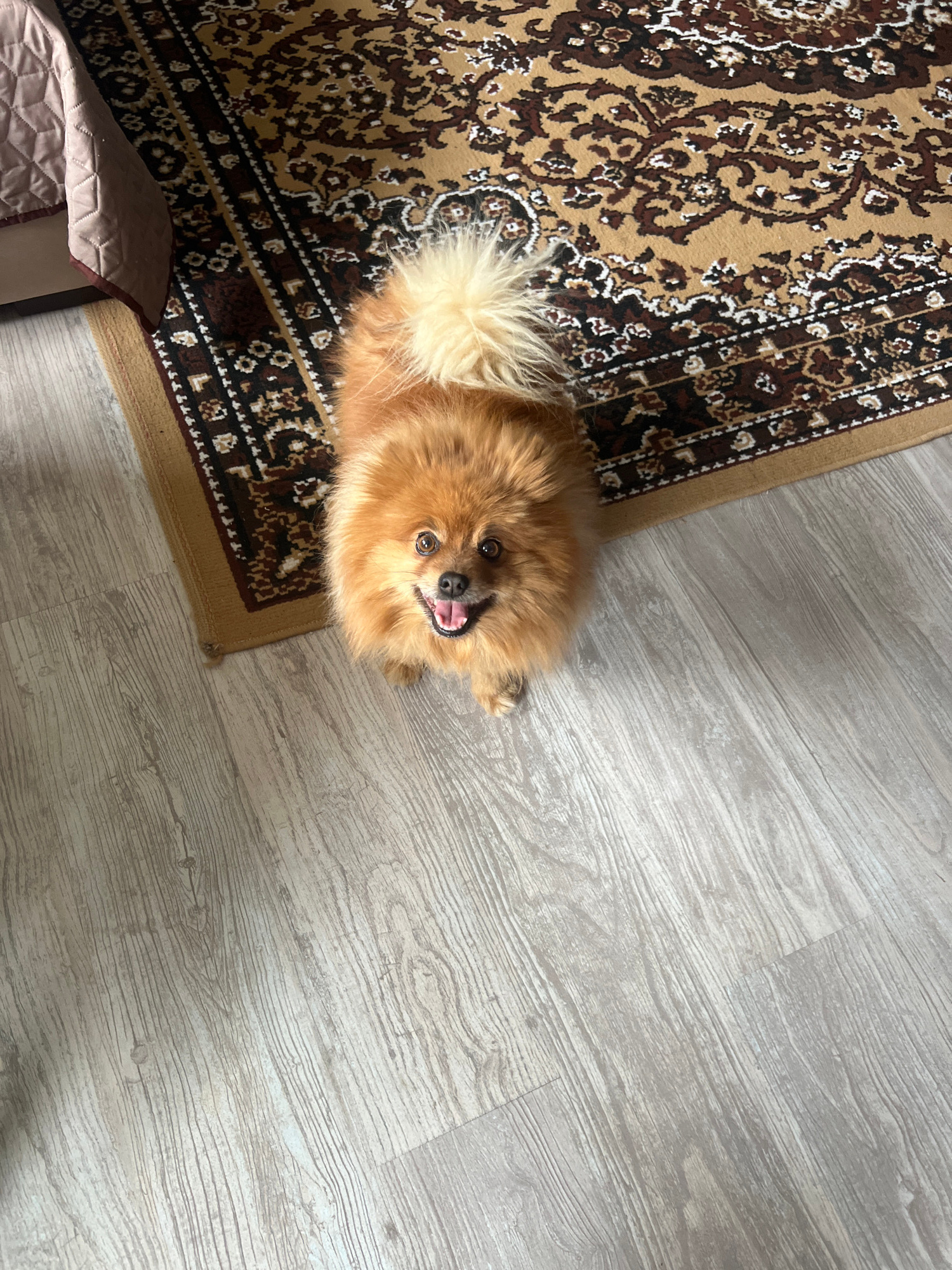 A Pomeranian dog with light brown fur and a white tail is lying on the corner of a patterned rug that is situated on a light-colored wooden floor. The dog is facing upwards and its mouth is open. The…read more