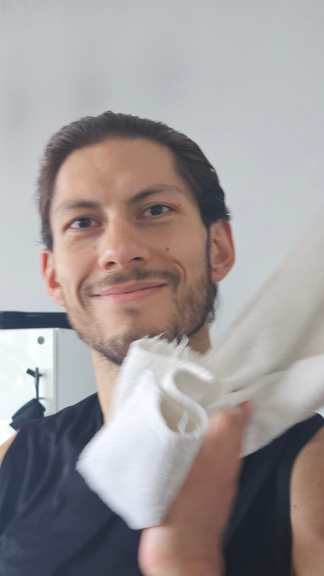 A close-up, portrait-style shot captures a man from the chest up, positioned against a plain, light-colored background. He has dark hair, styled back, and dark facial hair (stubble/beard). The man isβ¦read more