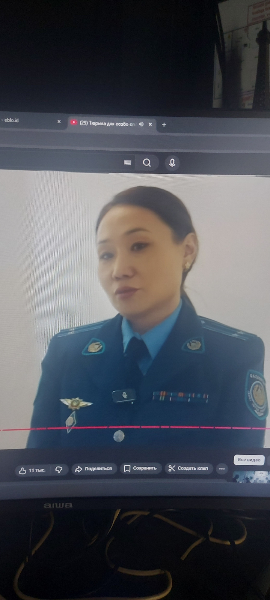 The image shows a computer screen displaying a YouTube video featuring a woman in a blue uniform, likely related to law enforcement or a similar service in Uzbekistan, possibly in the city of Tashkent…read more