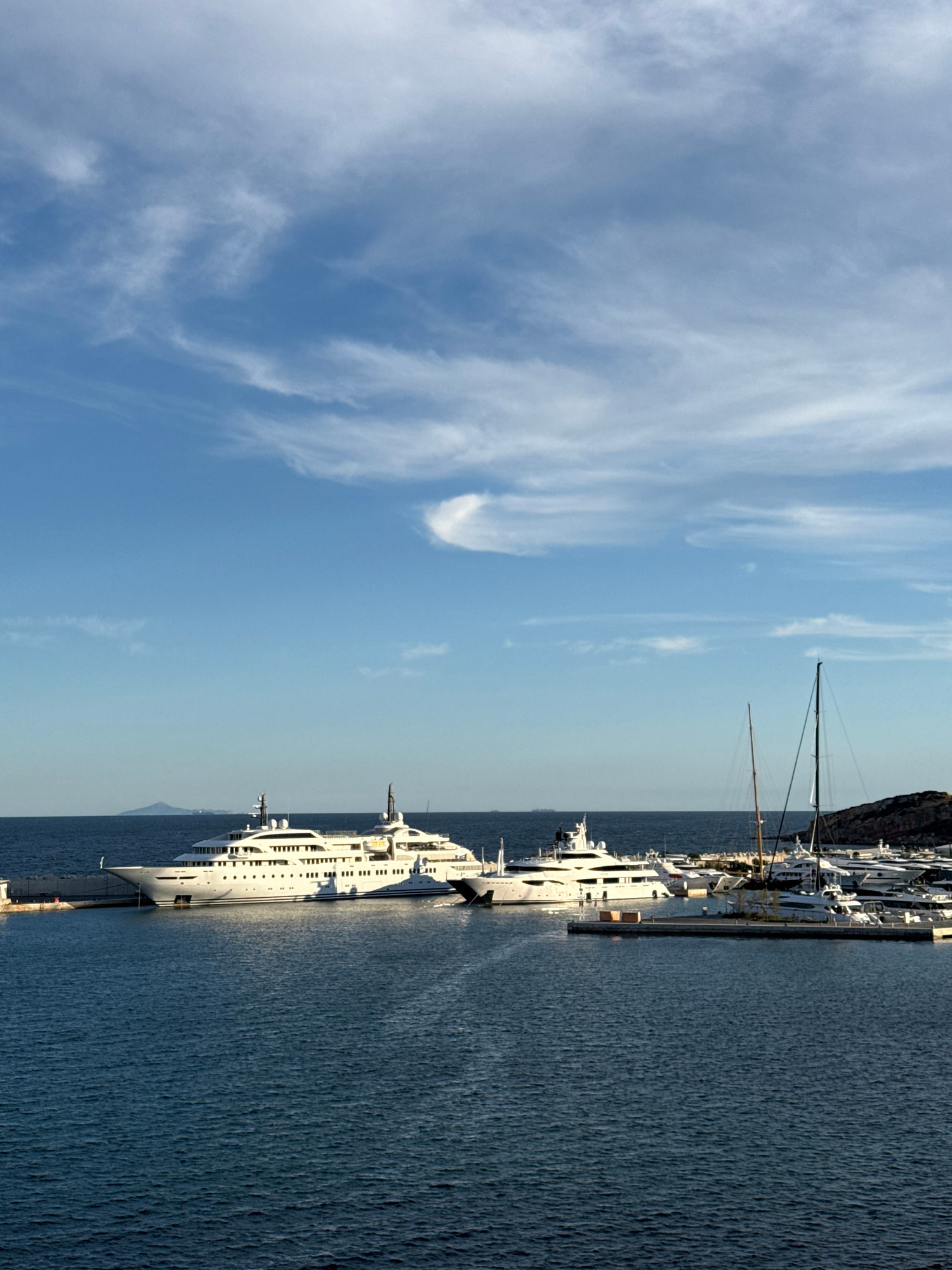 The image shows a harbor scene in Vouliagmeni, Greece. The sky is blue with wispy white clouds. Several yachts and boats are docked along a concrete pier. The water is a dark blue. In the background,…read more