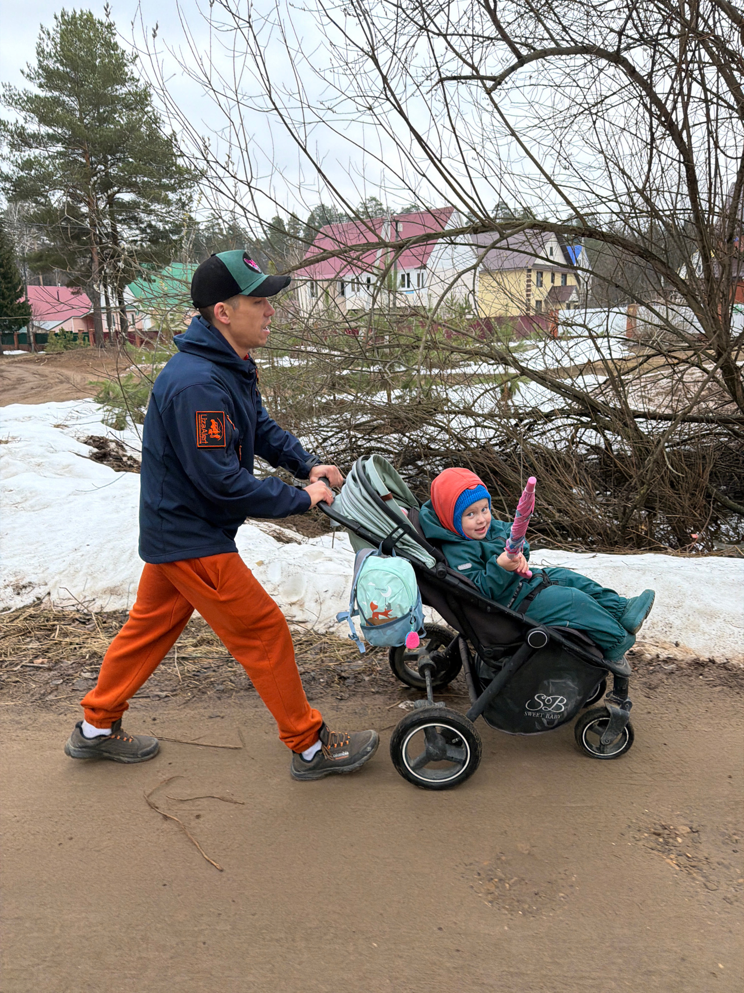 A man is pushing a baby stroller on a path in a park. The stroller contains a child wearing a red hat and green outfit, who is holding a pink object. The man is wearing a blue jacket, orange pants, a…read more