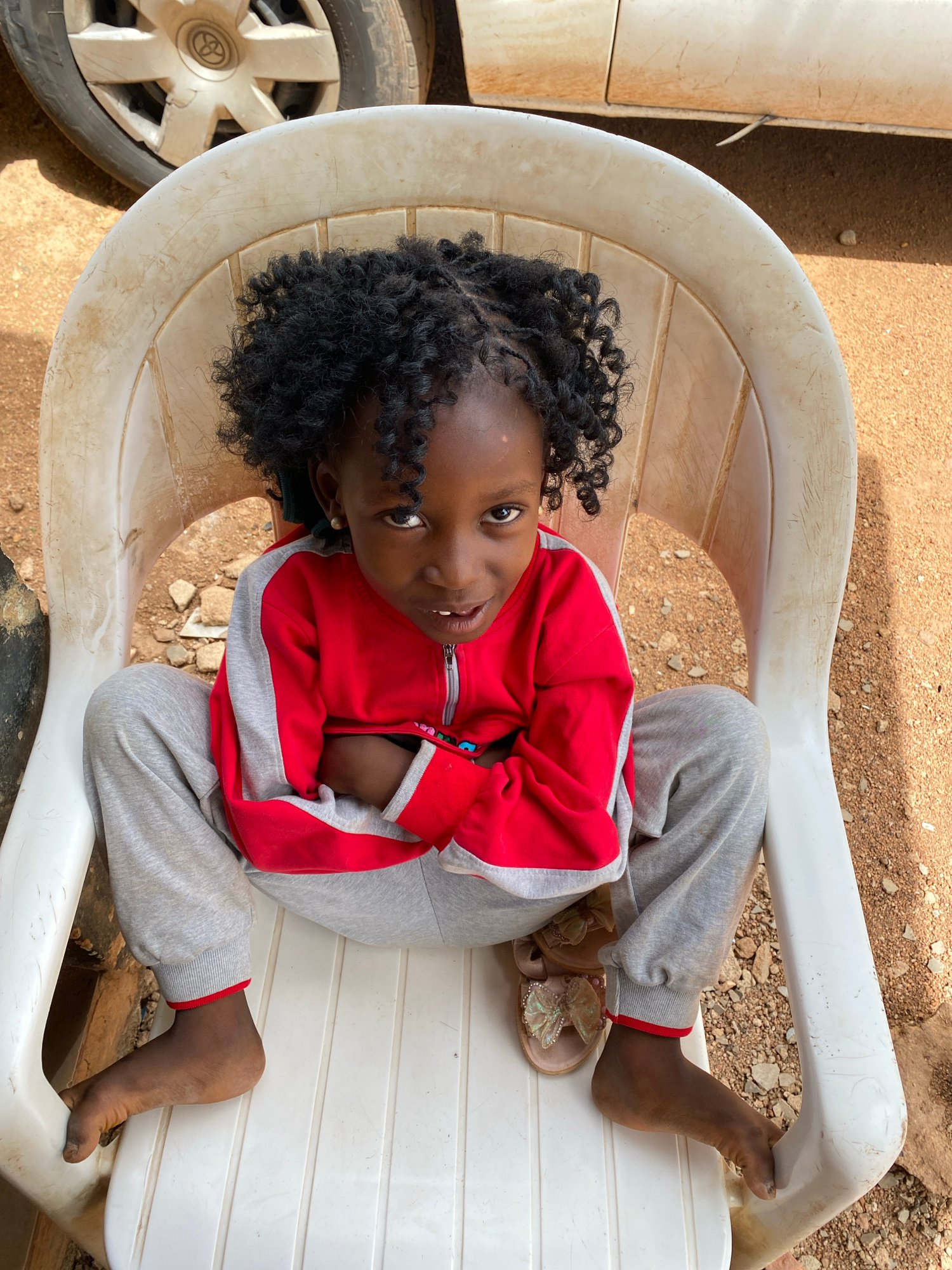 A young girl is sitting in a white plastic chair outdoors. She has dark curly hair and is wearing a red and gray tracksuit. Her feet are bare and appear dirty. The chair is slightly dirty, and the bac…read more