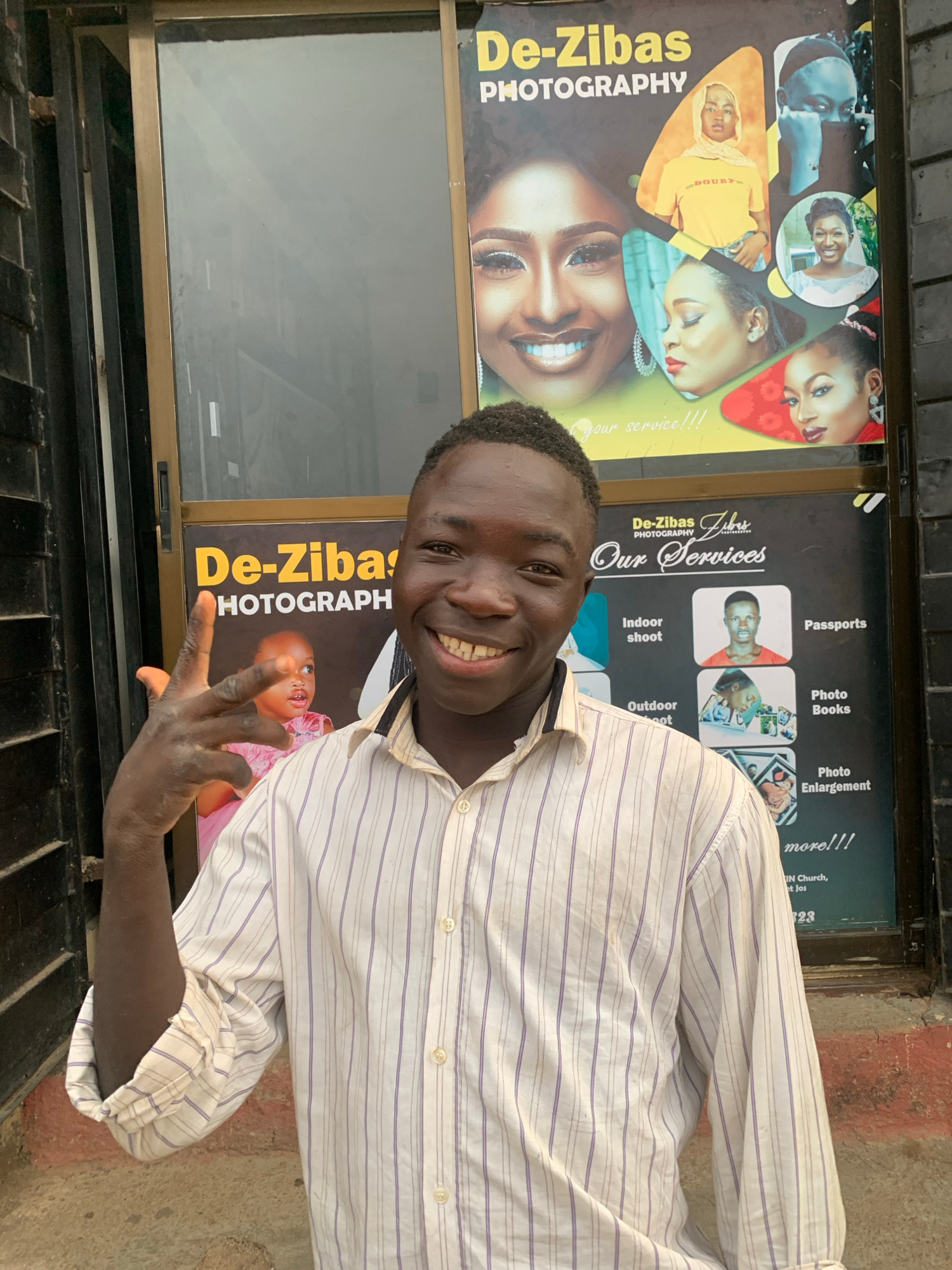 A man stands smiling in front of a photography studio called "De-Zibas Photography." The studio is located in Jos, Nigeria, specifically near "IN Church, et Jos," according to text on the signage. The…read more