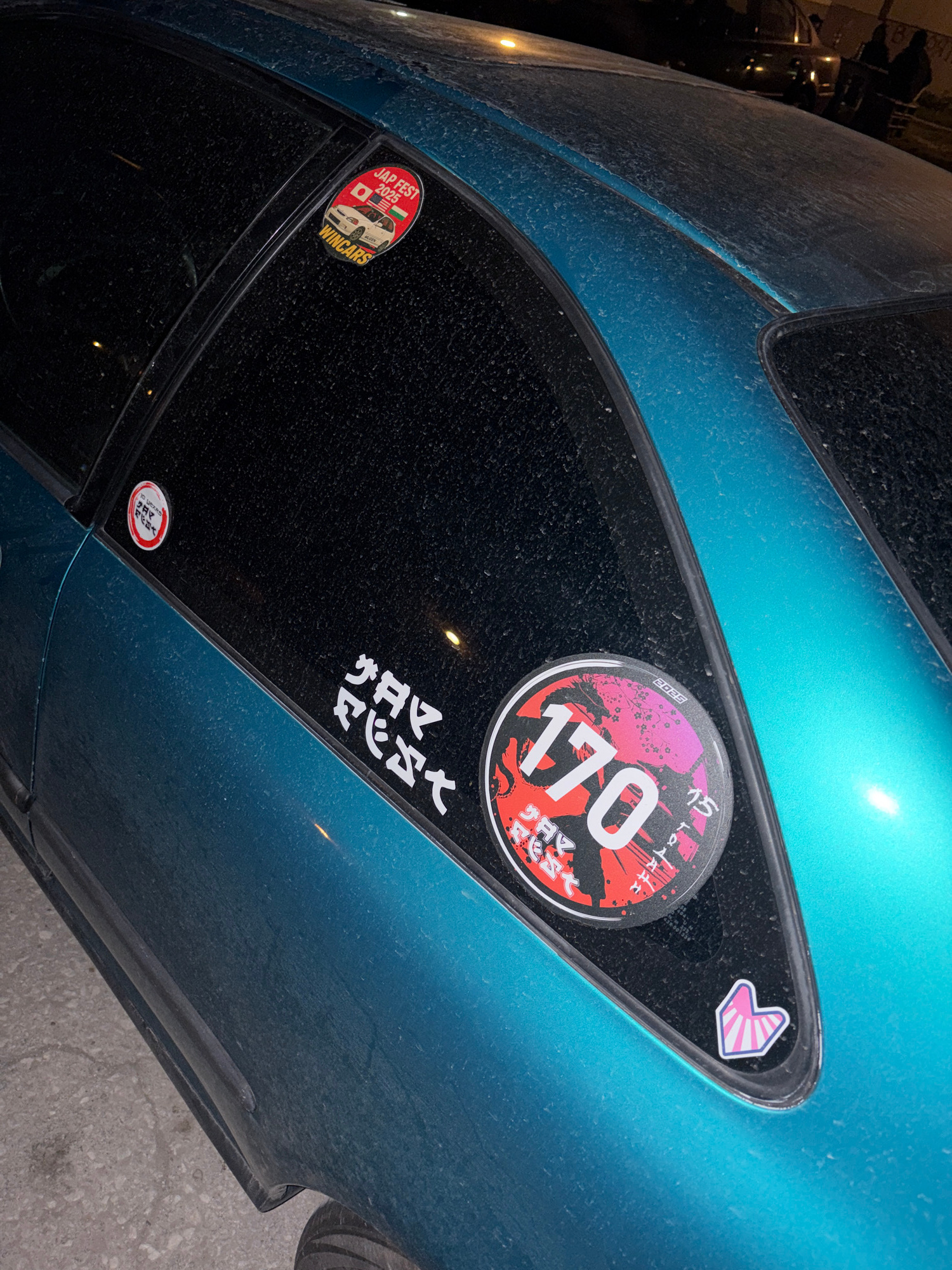 The image shows a close-up of the rear quarter panel and window of a dusty, turquoise-colored car. There are several stickers affixed to the window, including a round sticker with "170" prominently di…read more
