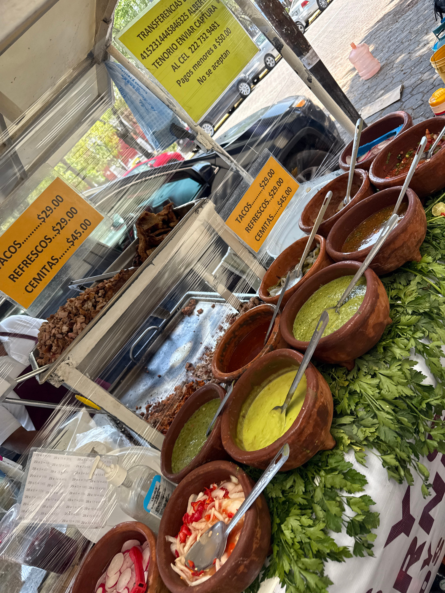 This image captures a vibrant street food stall in Puebla, Mexico, during daylight hours. The primary subjects are various condiments and toppings for traditional Mexican dishes, displayed in an organ…read more
