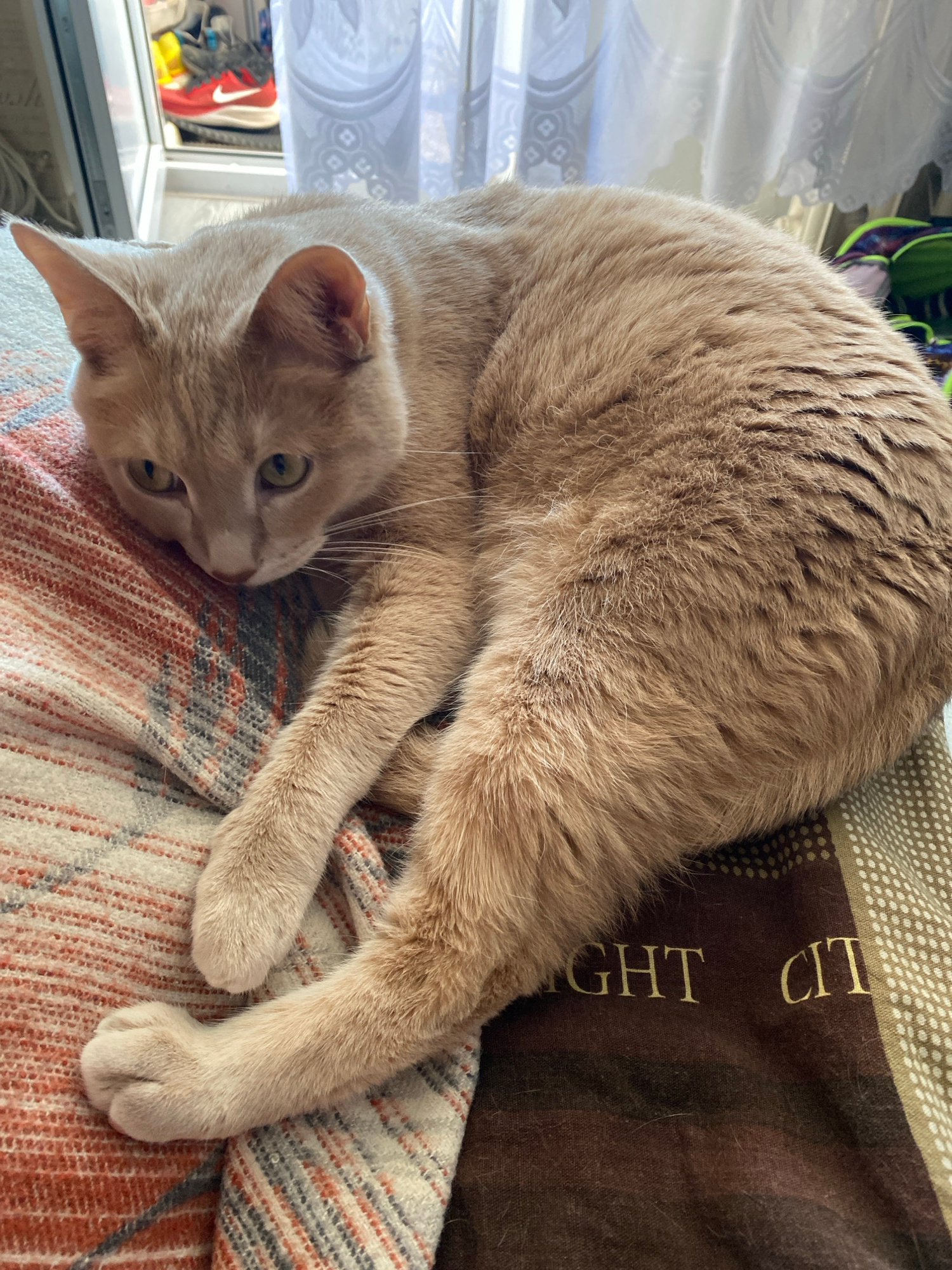 An image taken in Chaikovsky, Russia, features a light orange or cream-colored short-haired cat lying in a relaxed, contorted position, primarily on its back with its head turned to face the viewer. T…read more