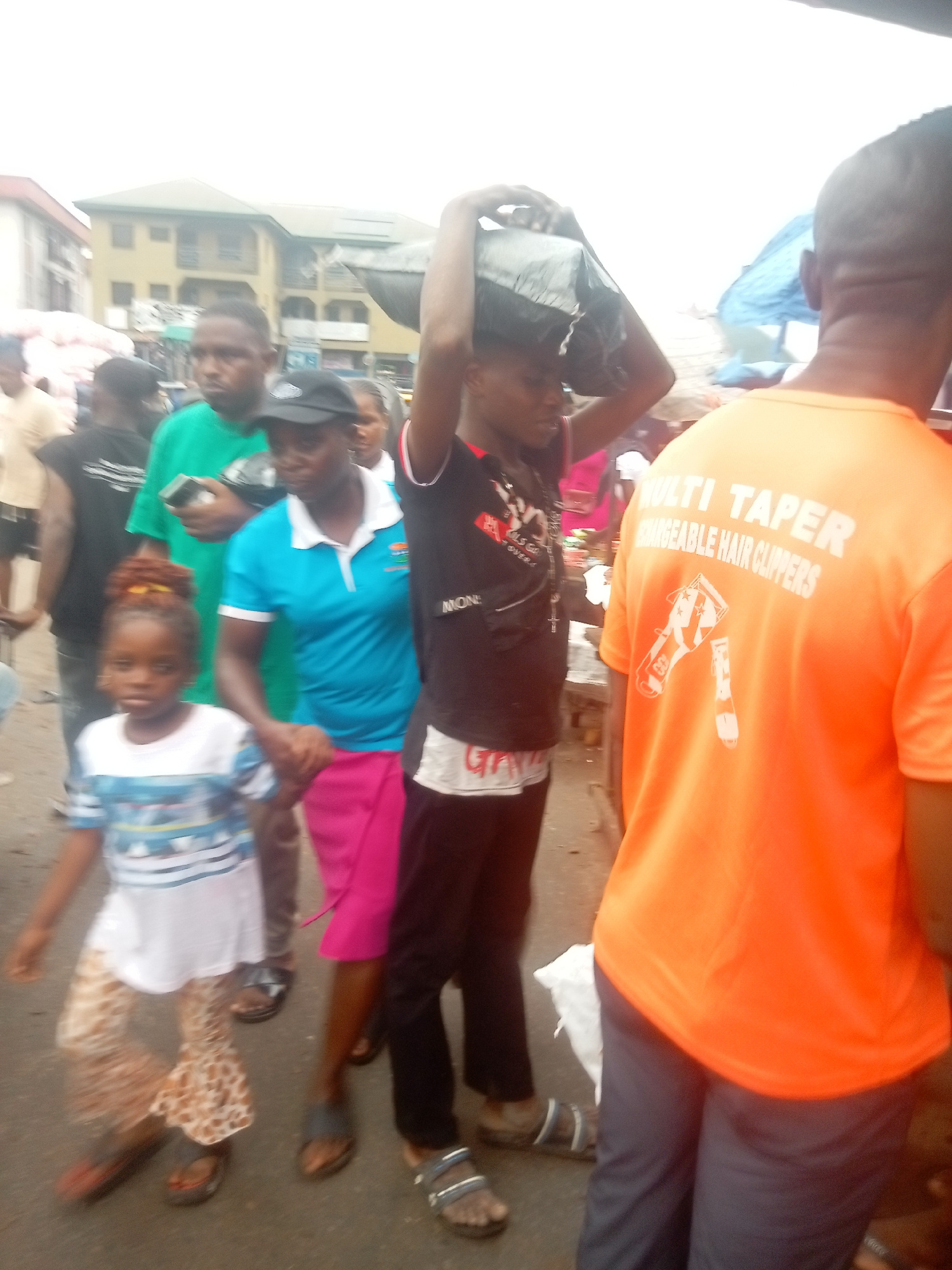 The image captures a street scene in Onitsha, Nigeria, evidenced by the architecture and the clothing styles of the people. A diverse group of individuals are visible. In the foreground, a child in a…read more