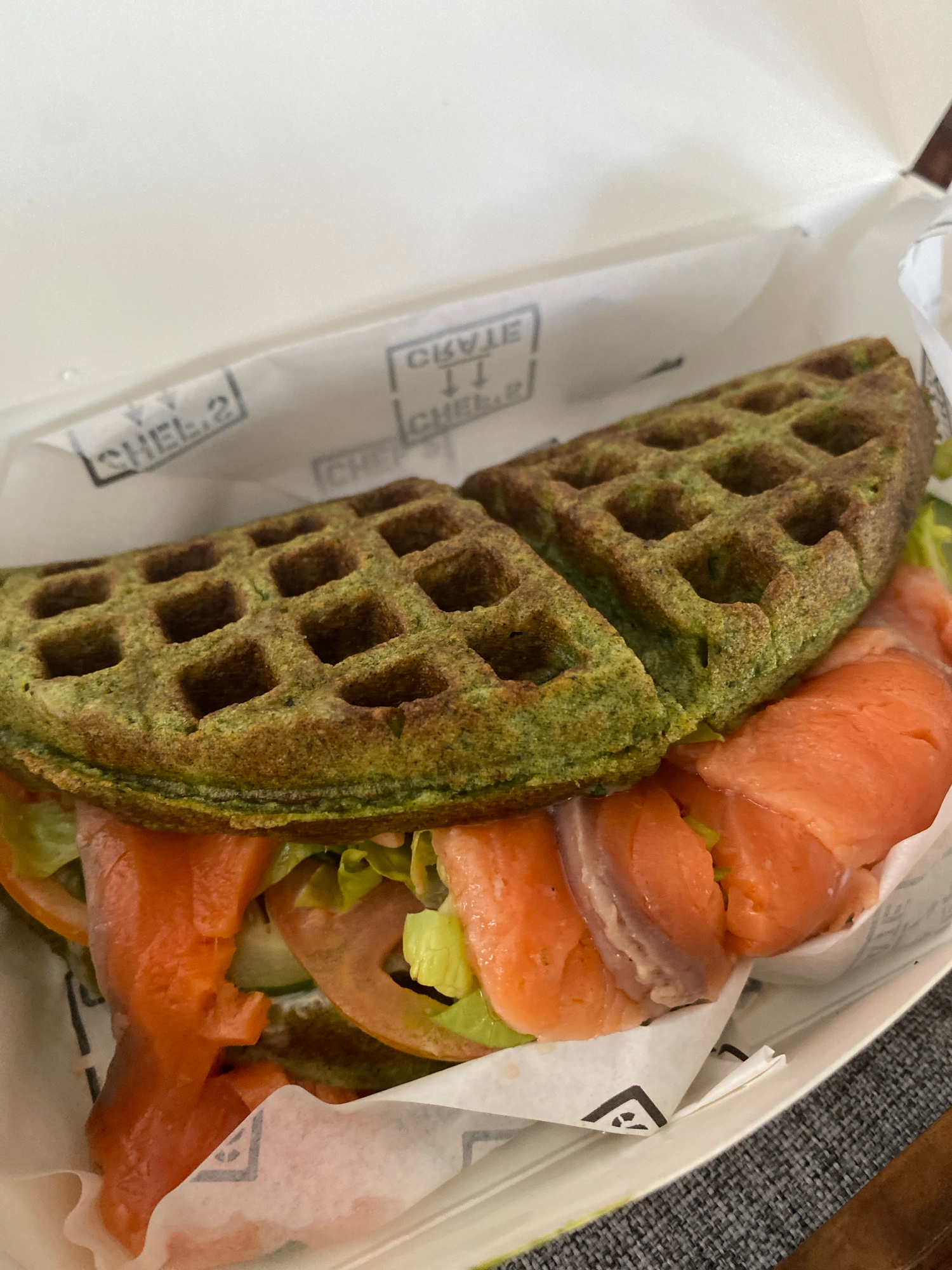 The image shows a green waffle sandwich, likely containing smoked salmon, lettuce, and tomato slices. The sandwich is in a white take-out container with printed branding, possibly "CHEF 2". The backgr…read more