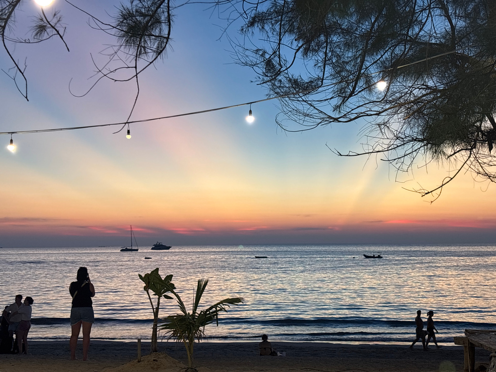 The image captures a beach scene at Kamala, Thailand, during sunset. The sky transitions from blue at the top to a warm orange and pink hue near the horizon. Several light bulbs are strung on a wire t…read more