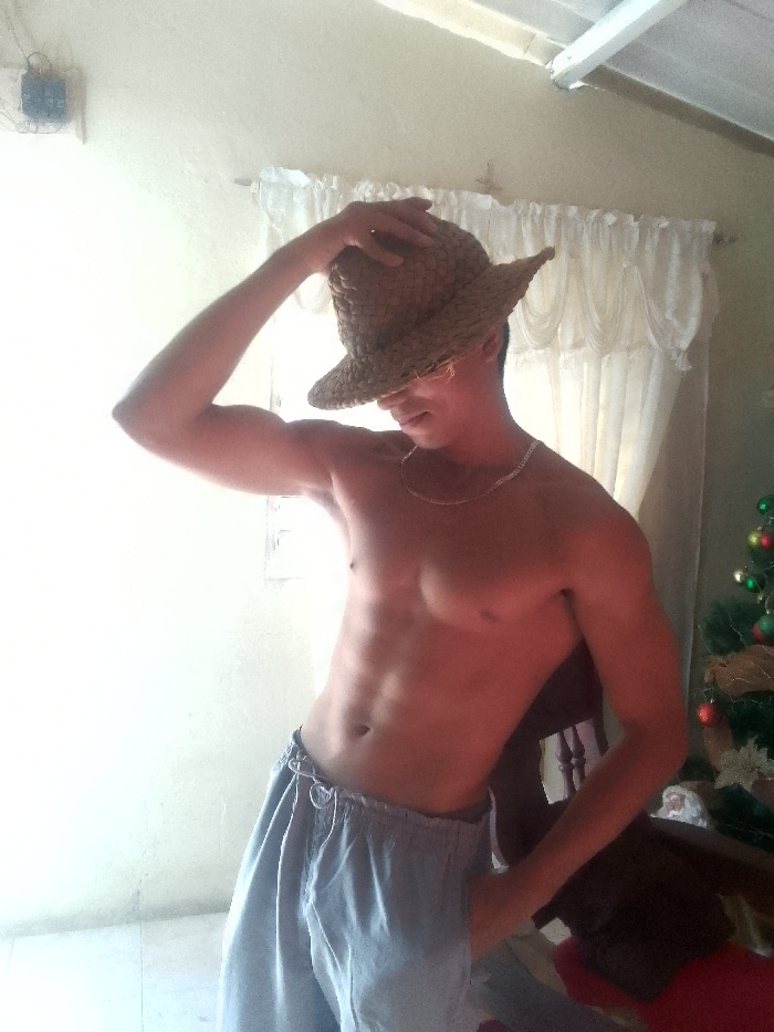 A shirtless man poses indoors with a woven hat partially obscuring his face. He has a slender build with visible abdominal muscles and wears light blue sweatpants. A silver chain is around his neck. O…read more