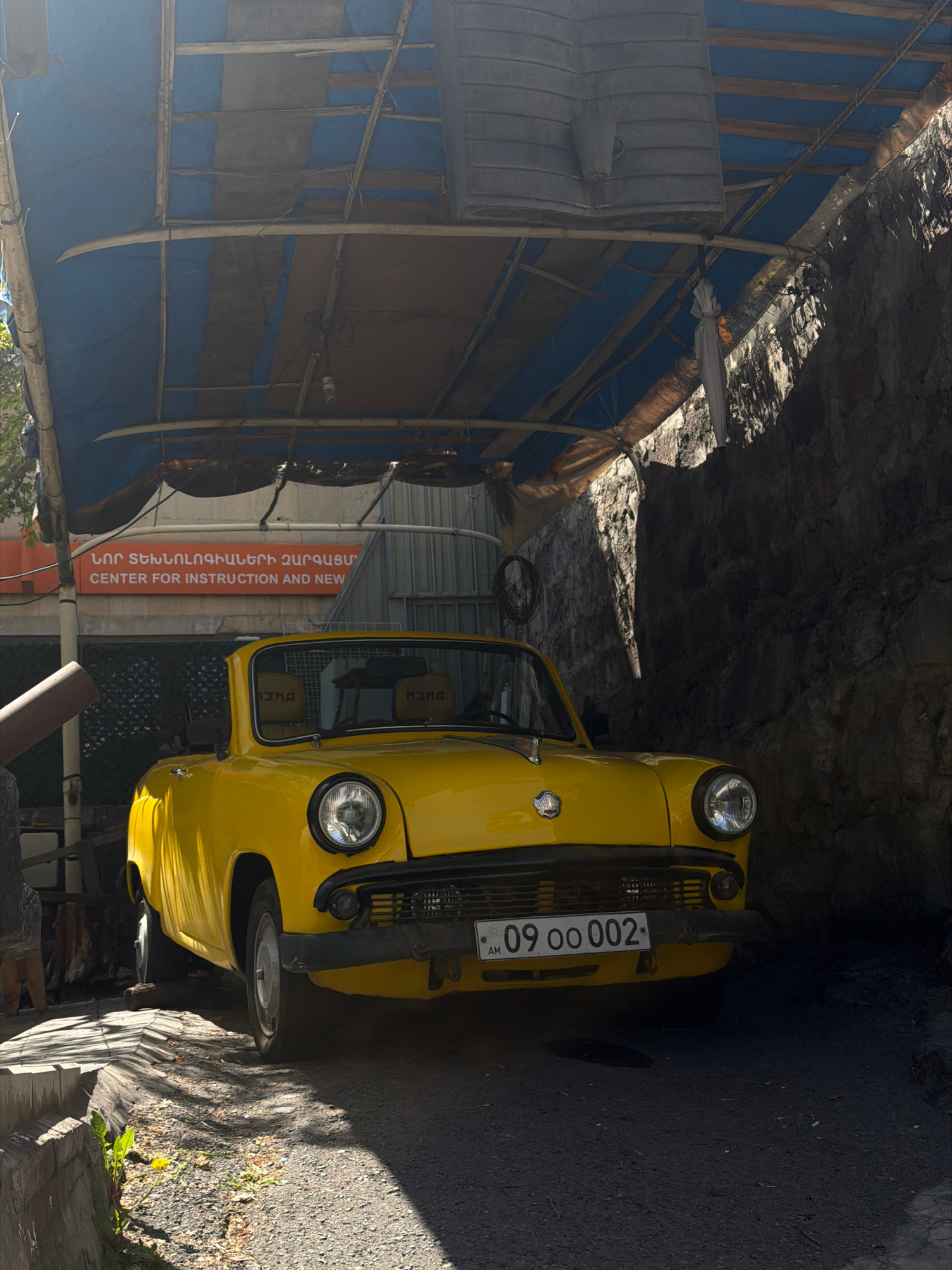 An upright view of the image reveals a bright yellow vintage car, possibly a ZAZ-965 or similar classic compact model, parked outdoors during the daytime. The car is seen from the front-right, featuri…read more