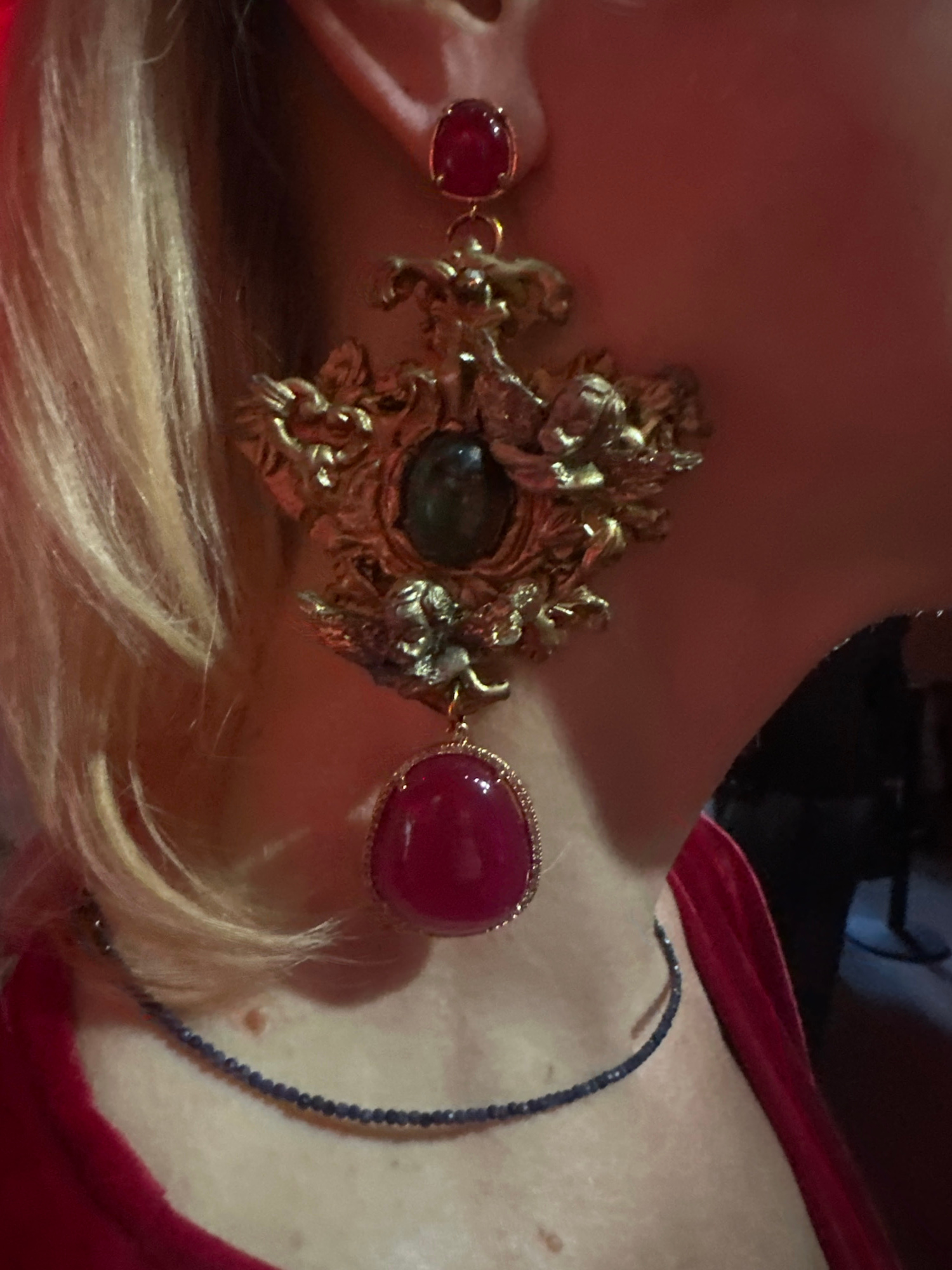 The image shows a person wearing a large, ornate gold-colored earring with multiple gemstones, including red and green stones. The earring is situated on the person's earlobe. The person also wears aβ¦read more