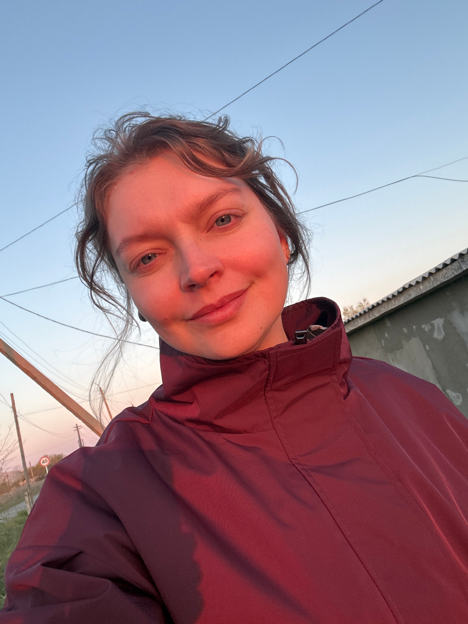 The media file is a rotated, close-up self-portrait of a person, likely a woman, with fair skin, light hair, and light eyes. She is looking directly at the camera with a faint, closed-mouth smile, and…read more