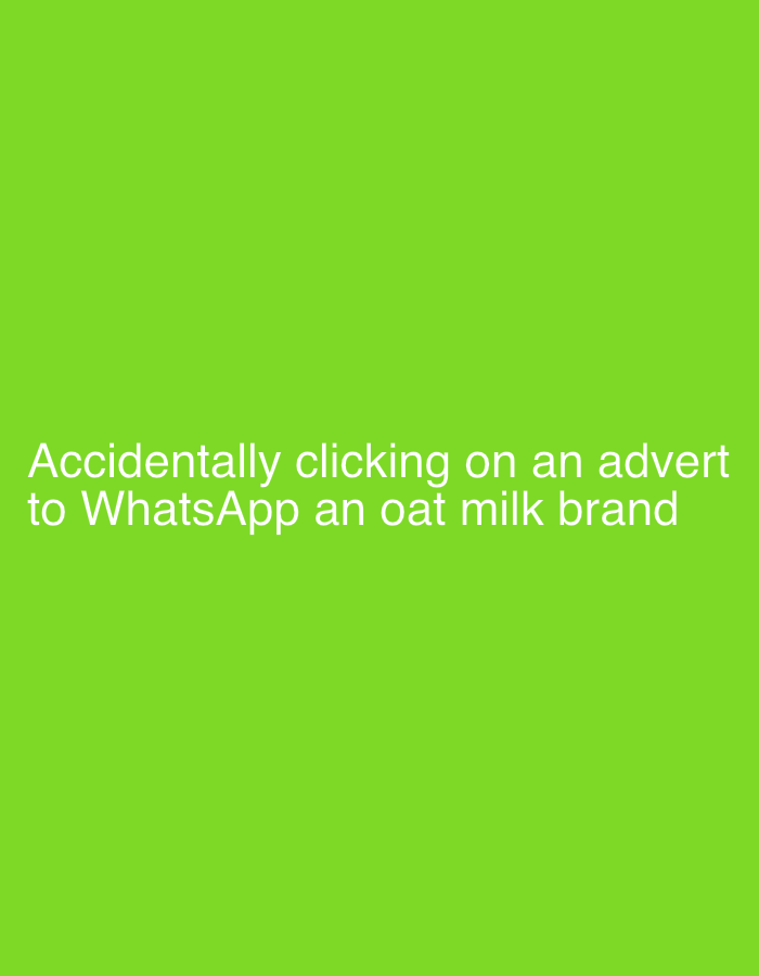 The image is a green background with the text "Accidentally clicking on an advert to WhatsApp an oat milk brand" in white font. There are no people, objects, or environmental cues to place the image i…read more