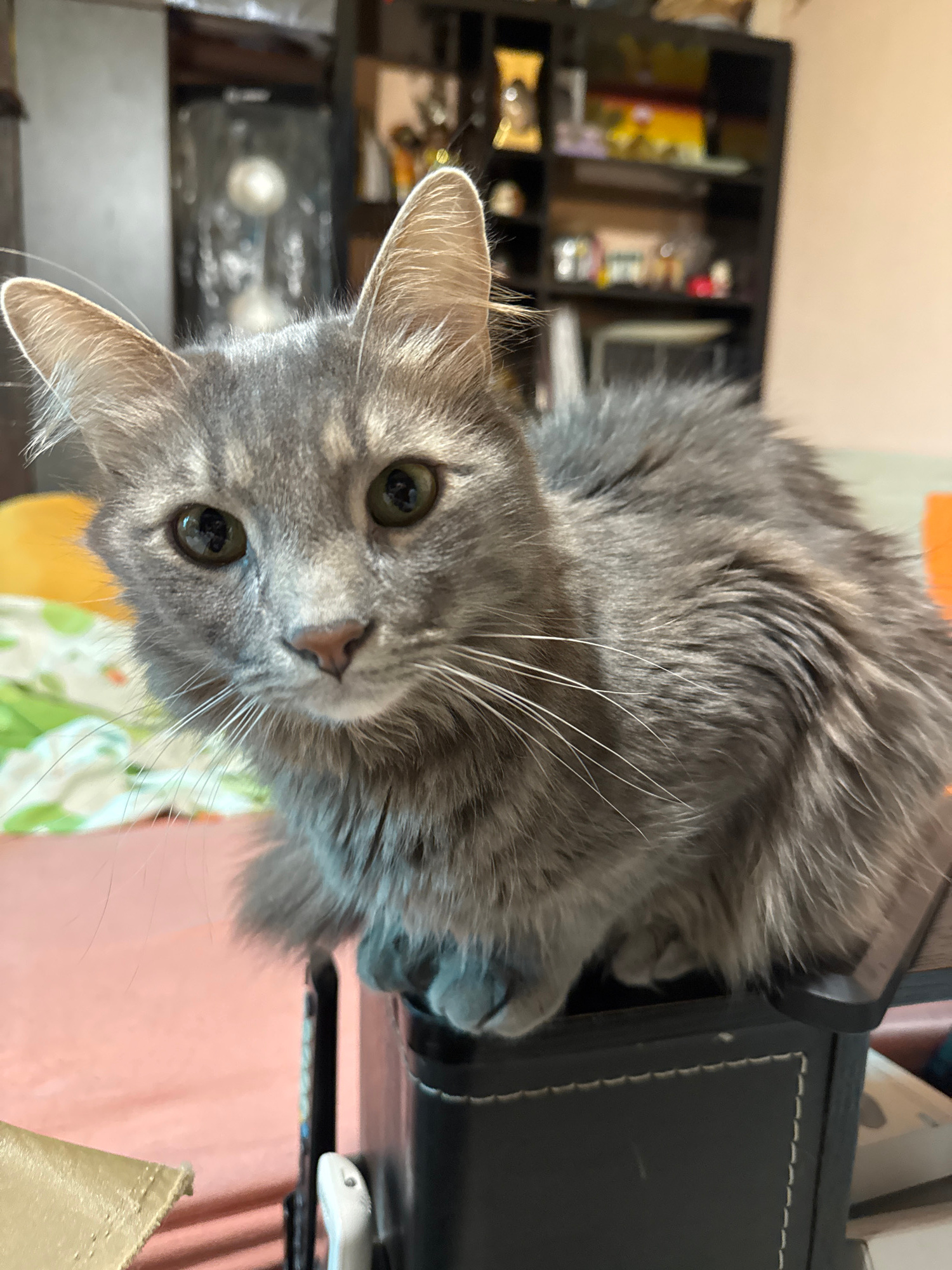 A gray cat with long whiskers is looking at the camera. It is lying on a black leather-covered surface. Behind the cat, there is a black shelf with various items on it. A pink wall and a patterned clo…read more