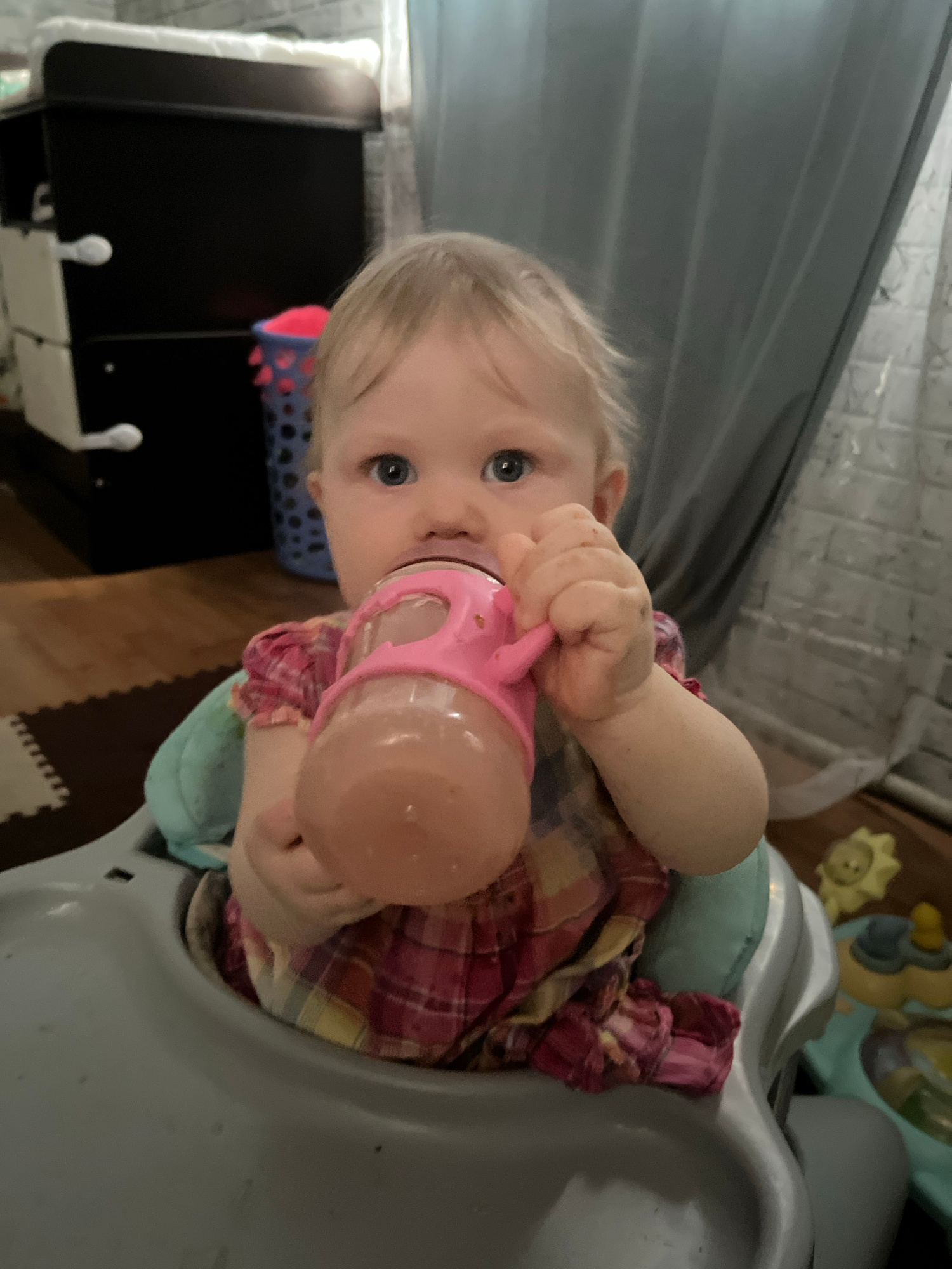 A baby with blonde hair and blue eyes is sitting in a gray high chair, holding a pink bottle to its mouth. The baby is wearing a plaid shirt. In the background, there is a blue curtain, a black cabine…read more