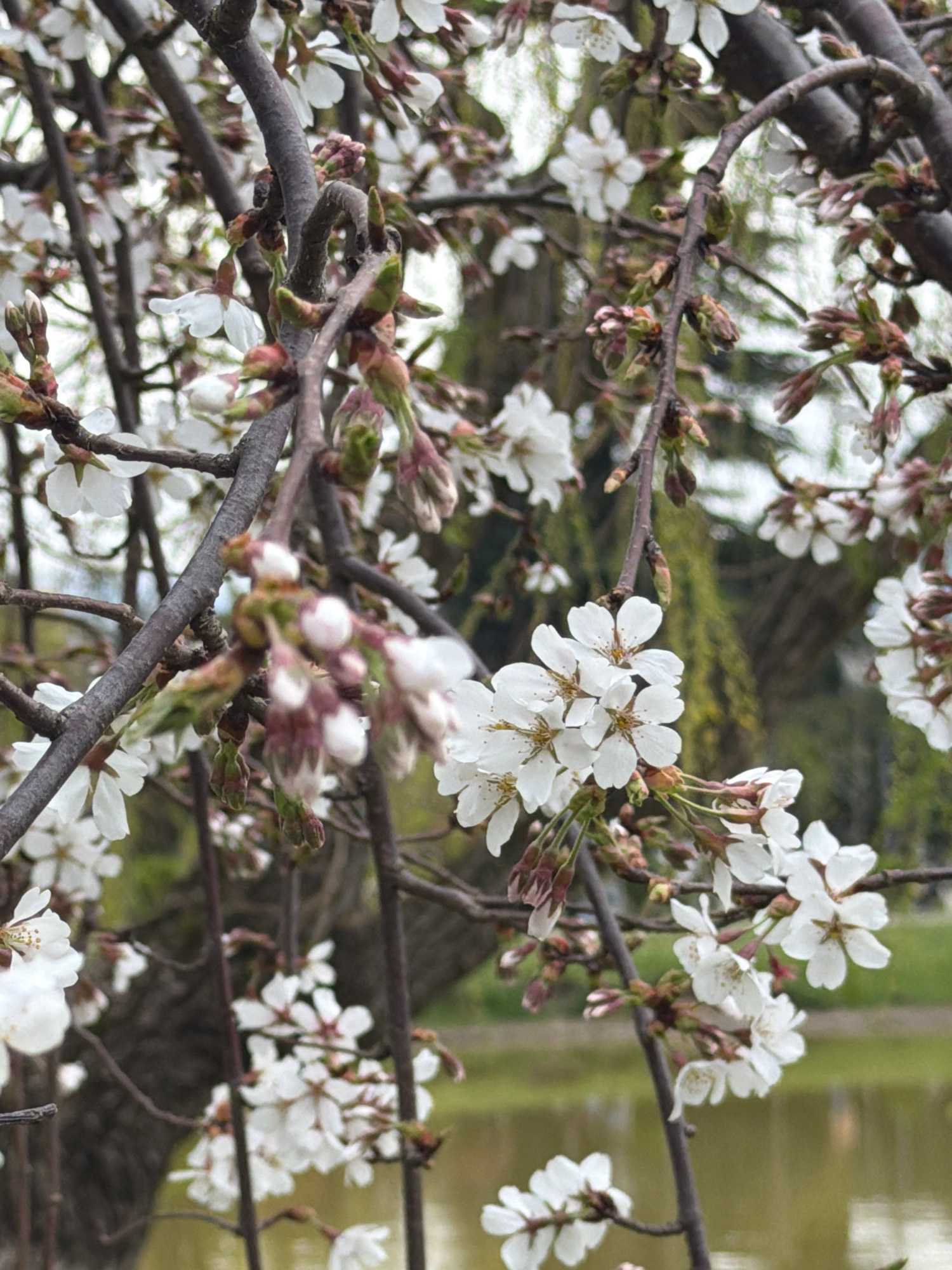 The image shows branches of a flowering tree, likely a cherry tree, with white blossoms in various stages of bloom. Some blossoms are fully open, while others are still closed in buds. The branches ar…read more