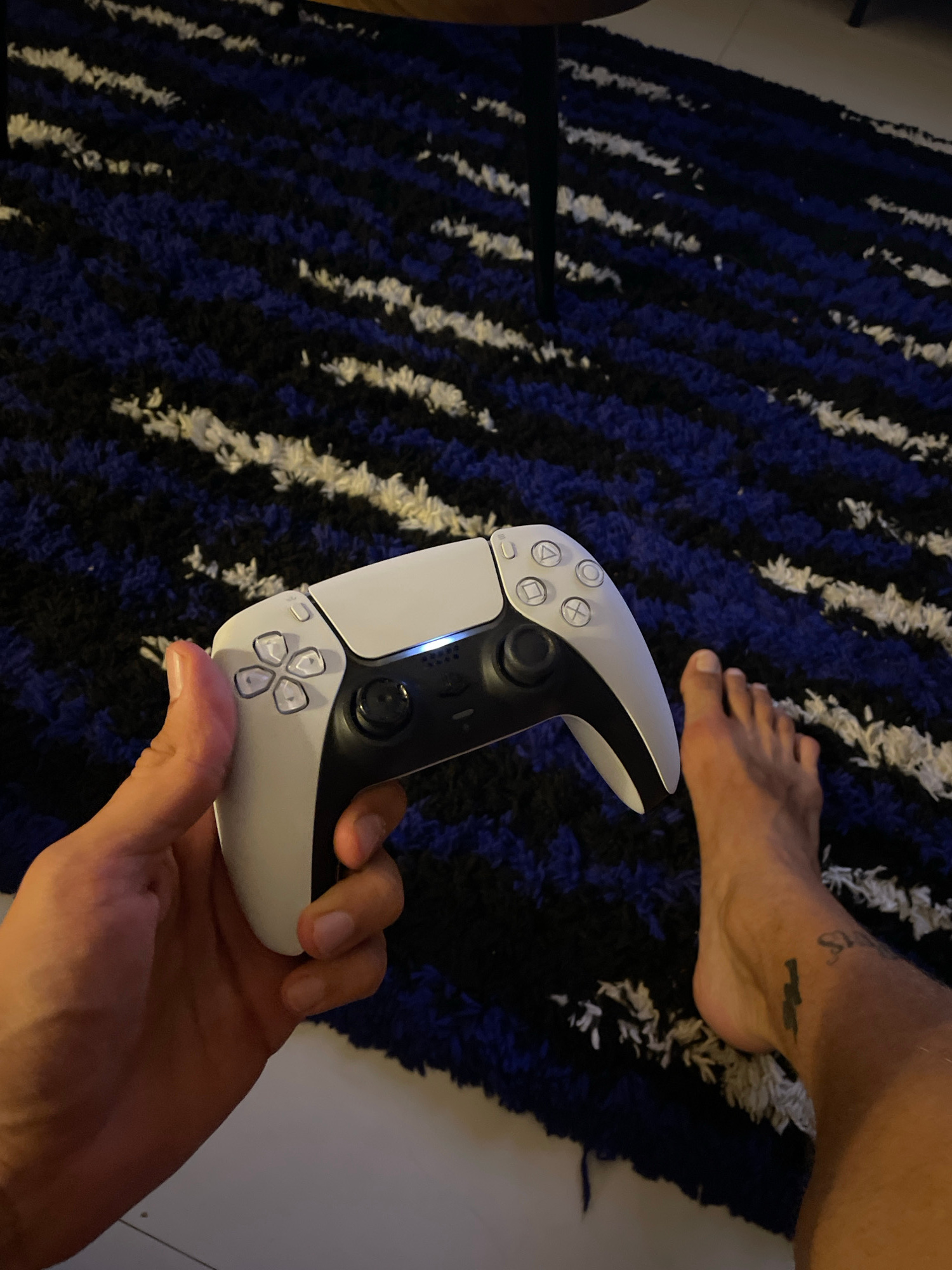 The image provides a close-up, high-angle view of a person engaged in a leisure activity within an indoor setting in Chang Phueak, Thailand. The primary subject is a person's right hand holding a whit…read more